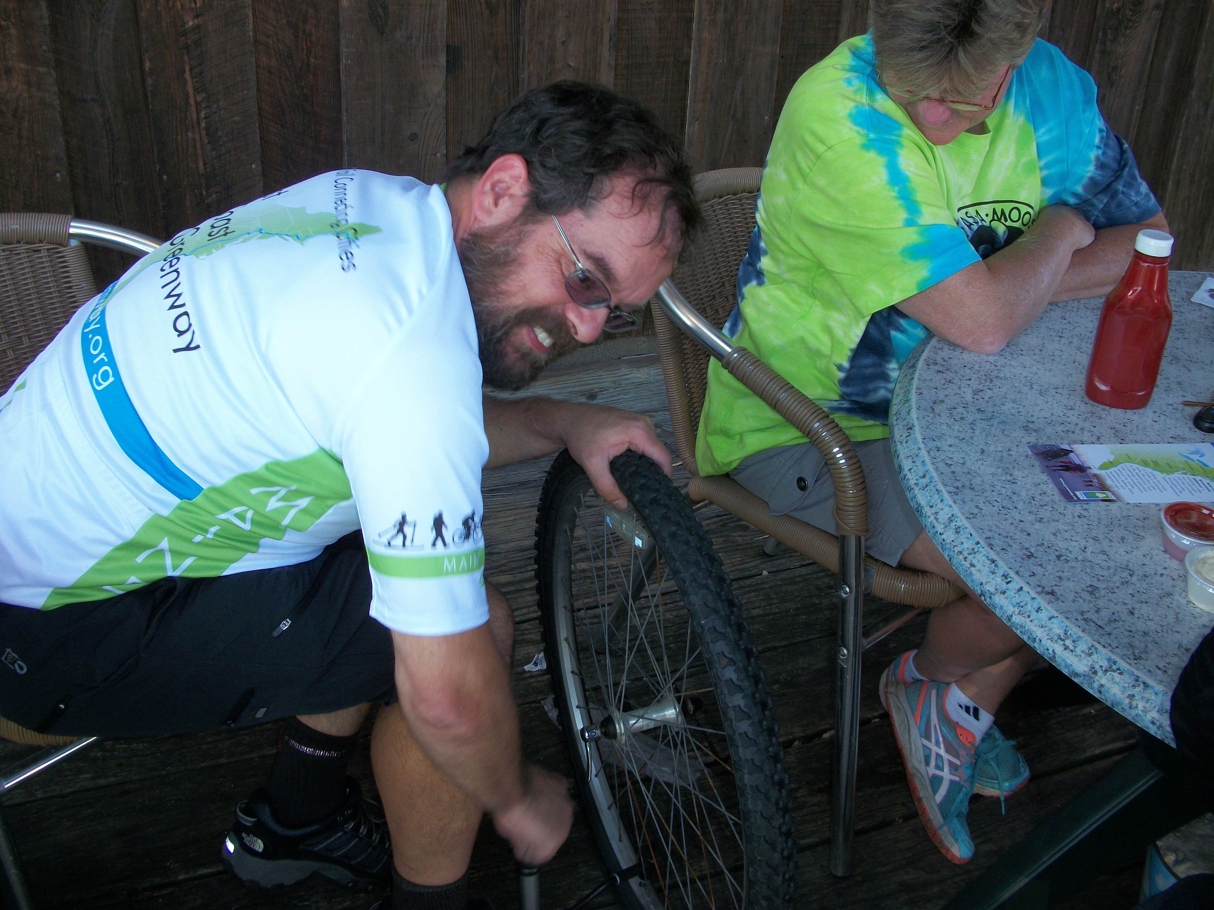 This last tale comes from lunch in Northeast (yes, the name of a town in Maryland), where one person was pretty emphatic that the place to go was a seafood restaurant. Somehow I ended up with a fast group of guys and we were the first in (only, I think, because an even faster group took some detours). As we were waiting for our soft-shell sandwiches, a group of women at the next table leaned over and asked if we, being bikers, knew where to find a bike shop. Turns out one had a flat. So I helped take the wheel off, and Jack did the repair work.