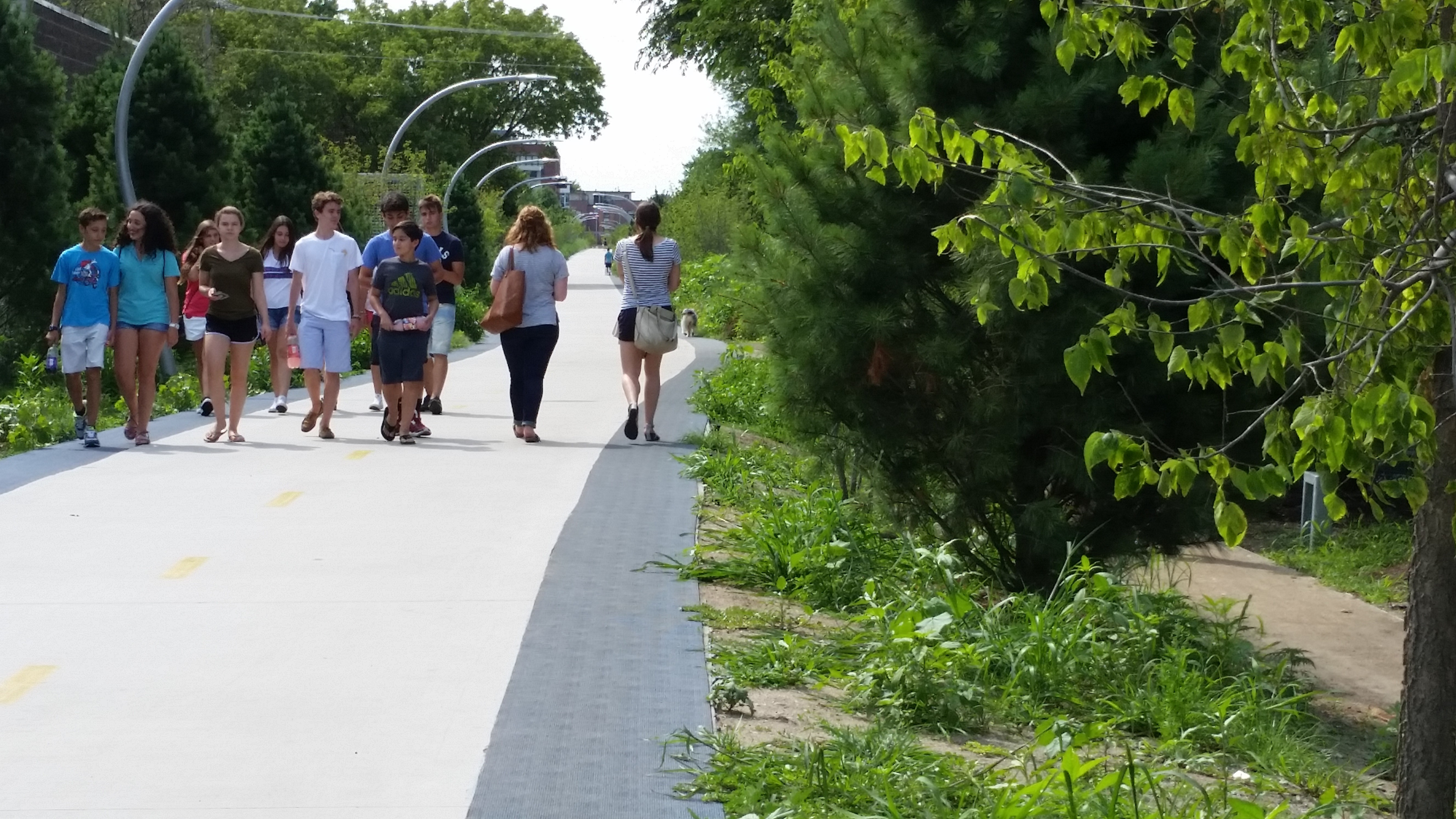 It is twice the length of New York City’s High Line, plus wider and open for bikes. Sweeping on-off ramps make it so accessible. The plantings are still going in so it’s not as lush (and won’t be as precious — but you can see the work of the High Line’s designer in the Lurie Gardens in Chicago’s Millennium Park).