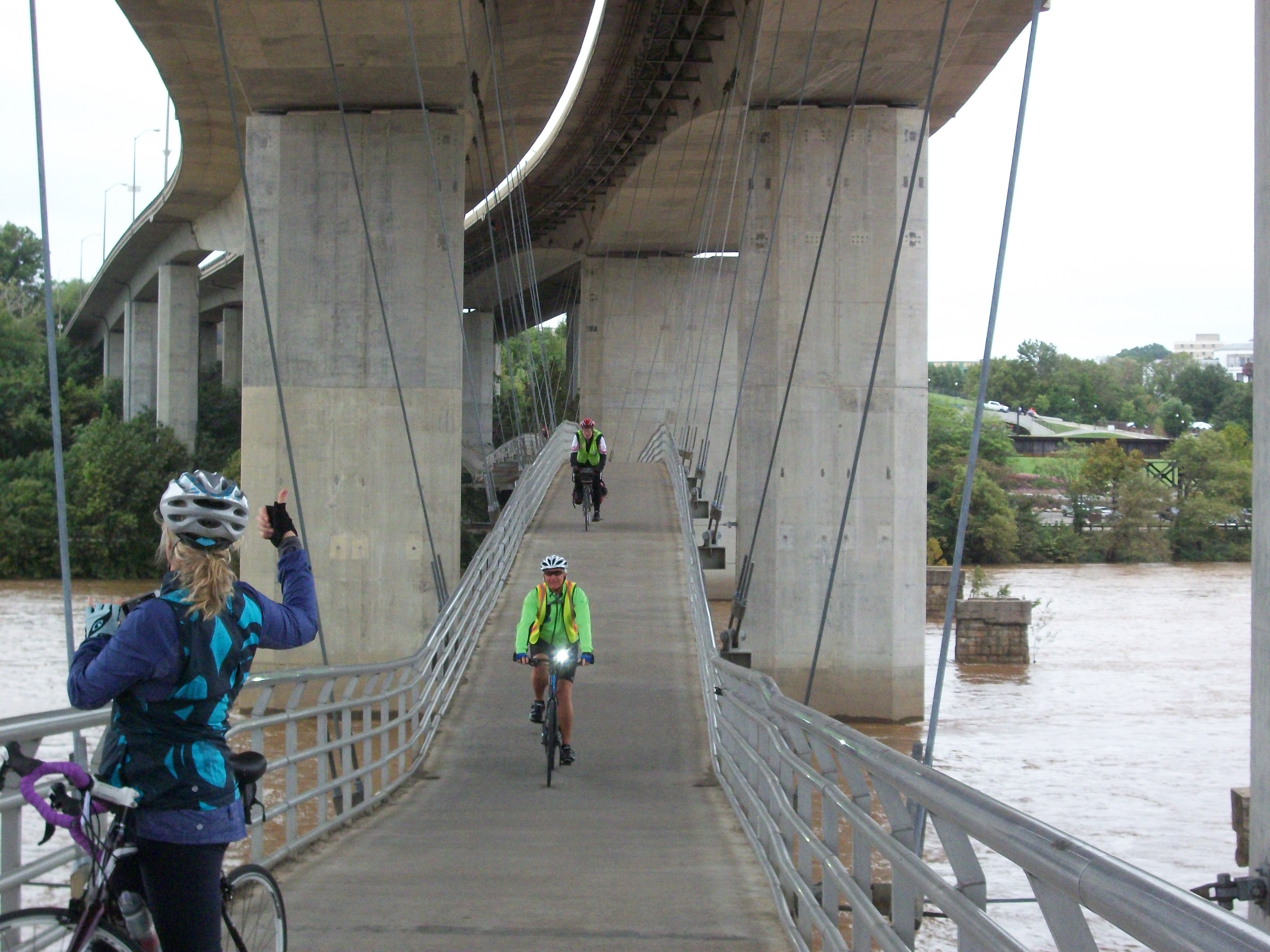We detoured around the state capital and the odd-looking George Washington on top of his monument and inspected the Confederates’ iron works. All this sightseeing put us in the rear of the East Coast Greenway troops even before we crossed the raging James River on a wavy bridge snuck in below the highway bridges.