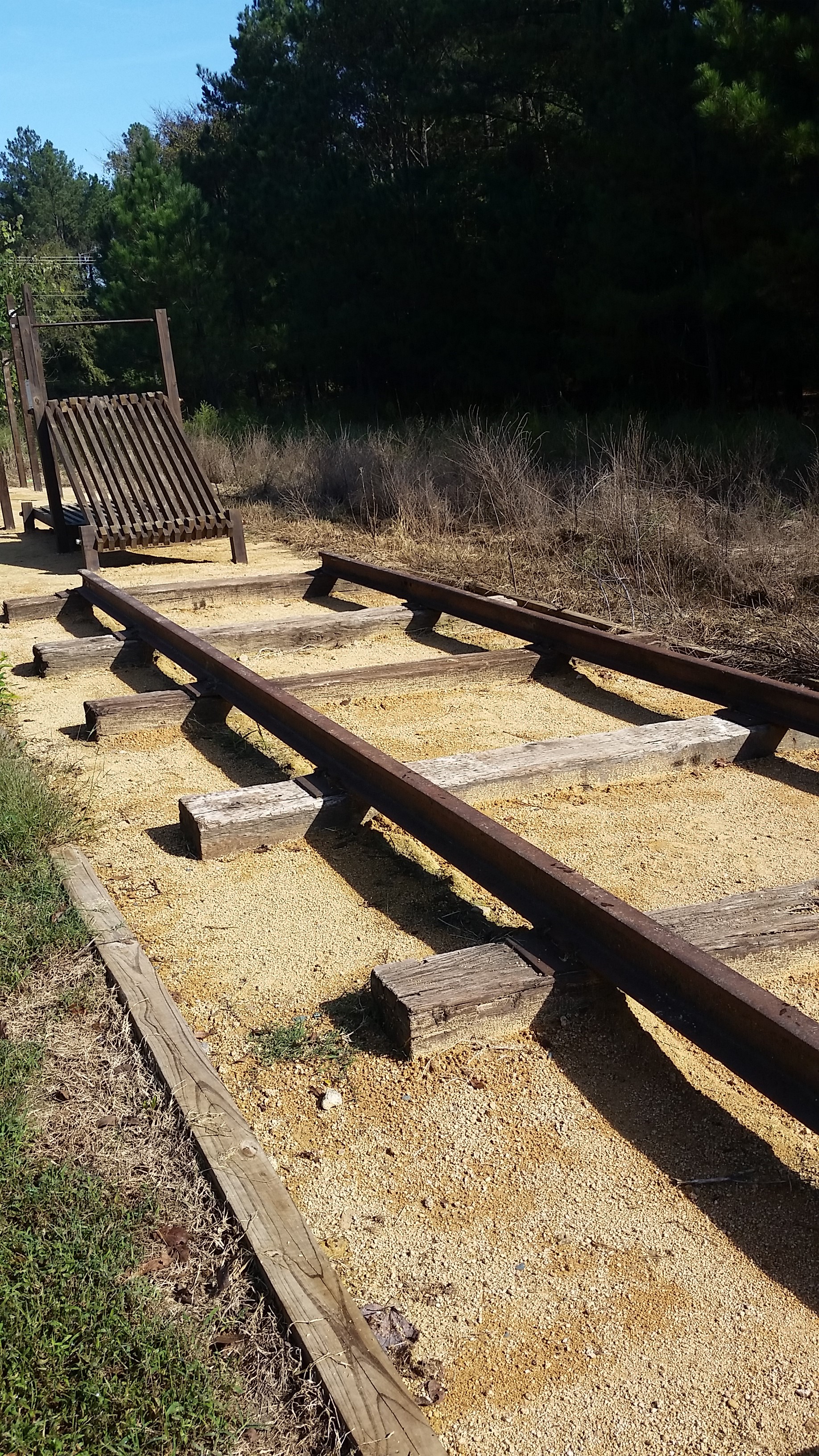 Clever play on rails in this balance beam and jump/squat exercise equipment on the American Tobacco Trail: