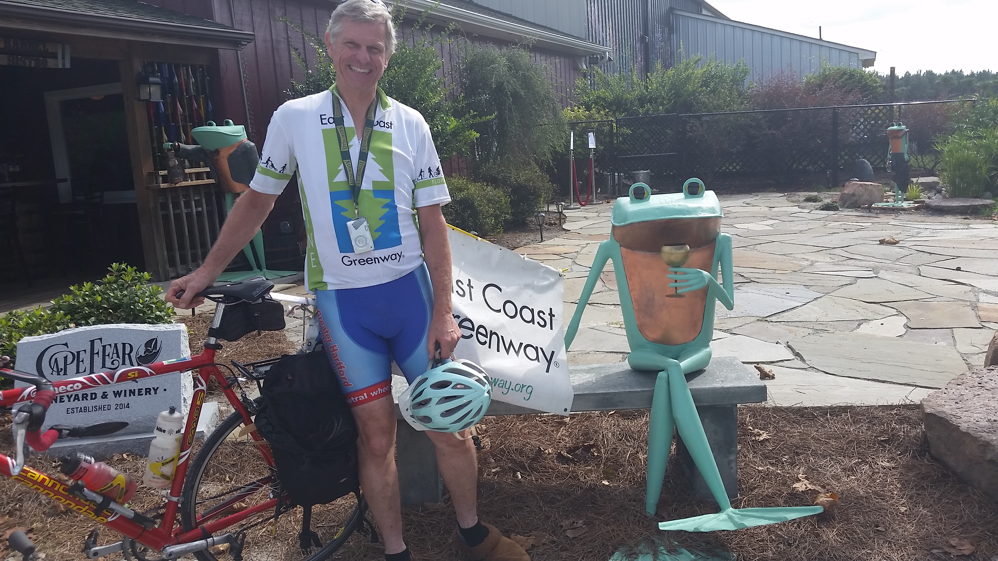 Today was all about getting to the charming Cape Fear Vineyard and Winery in Elizabethtown for lunch. No trails today, just mostly quiet roads, though generally without a nice shoulder. Chris and I flew, averaging more than 15 miles an hour. Nice tailwind too. I don’t know if I’ve ever been this consistently fast.