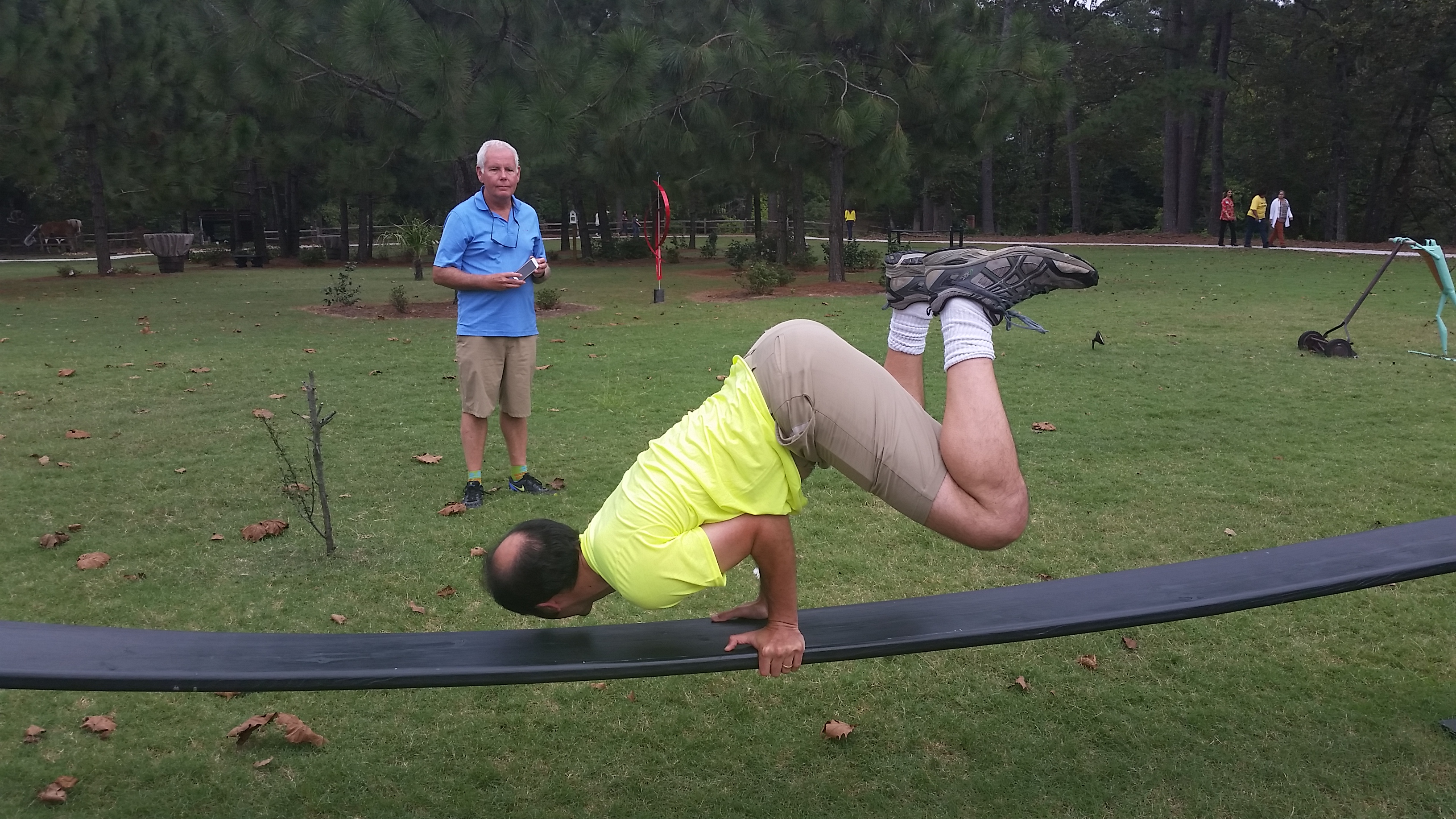 Dennis showing off his yoga skills on a bouncing “bonding board” at Cape Fear Vineyard and Winery in Elizabethtown:
