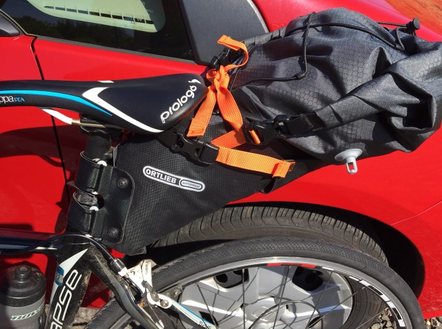 A bikepacking class at REI led to buying a bikepacking bag that attaches to the seat and seatpost. My favorite local bike shop suggested some slightly wider tires that can handle trails, rather than my slick road tires. But I still needed to make sure it would all work. And Clive’s new toy is a carbon “gravel-grinder” bike that can handle a rack and panniers, but not unlimited weight.