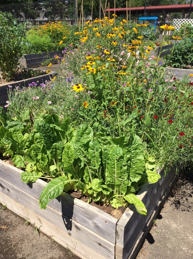 I loved how unused tennis courts became an unused skateboard park became a bustling community garden, with just about every raised bed claimed. Flowers, tomatoes, peppers, salad greens, cabbage … you name it.