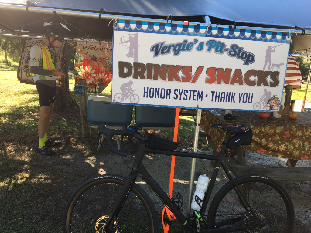 It’s a lovely trail, with one section opened only a few months ago and just a little bit left to go until all 50+ miles are built. How nice to be able to ride side by side, chatting away without needing to look out for motorists. And if we needed anything, why, there was Vergie’s stand selling everything from snacks to bottles of Gatorade to spare inner tubes, all on the honor system.