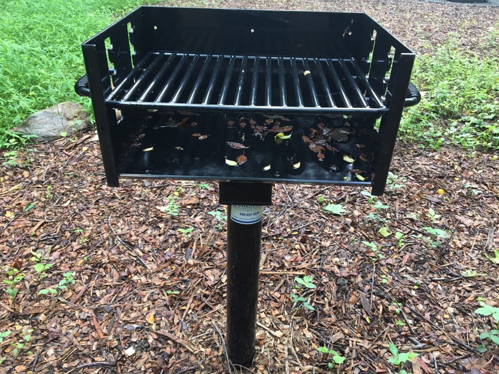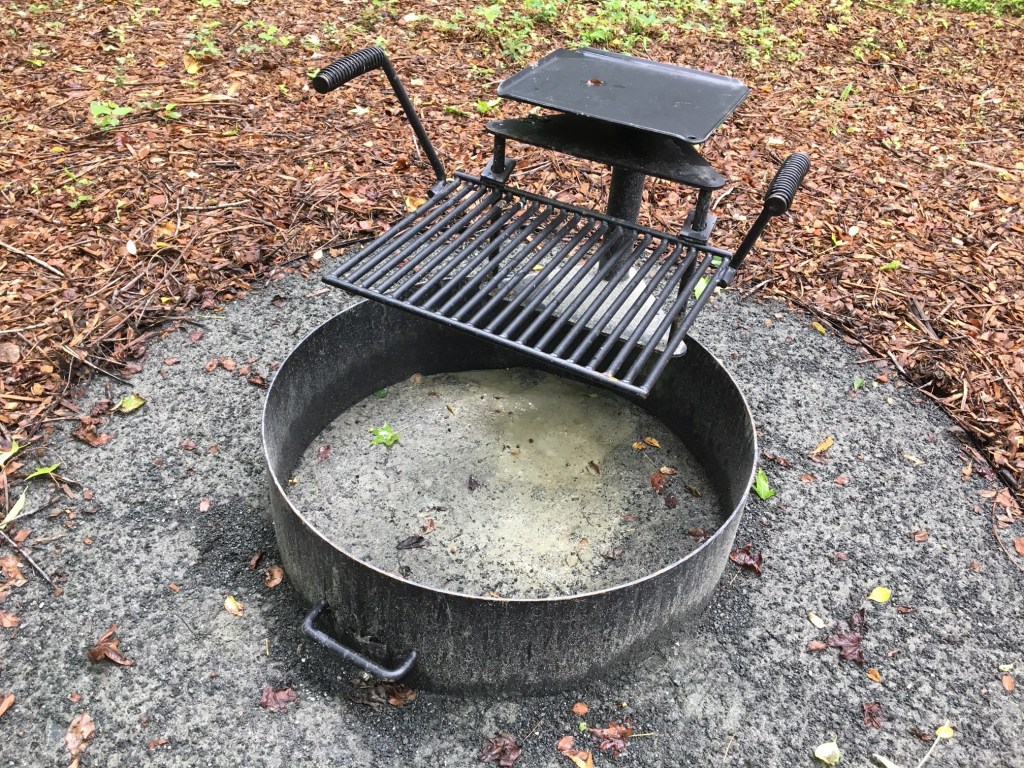 Then each site has a charcoal grill AND a campfire pit (with a rack that goes up and down, so seems suitable for grilling to me) plus a picnic table.