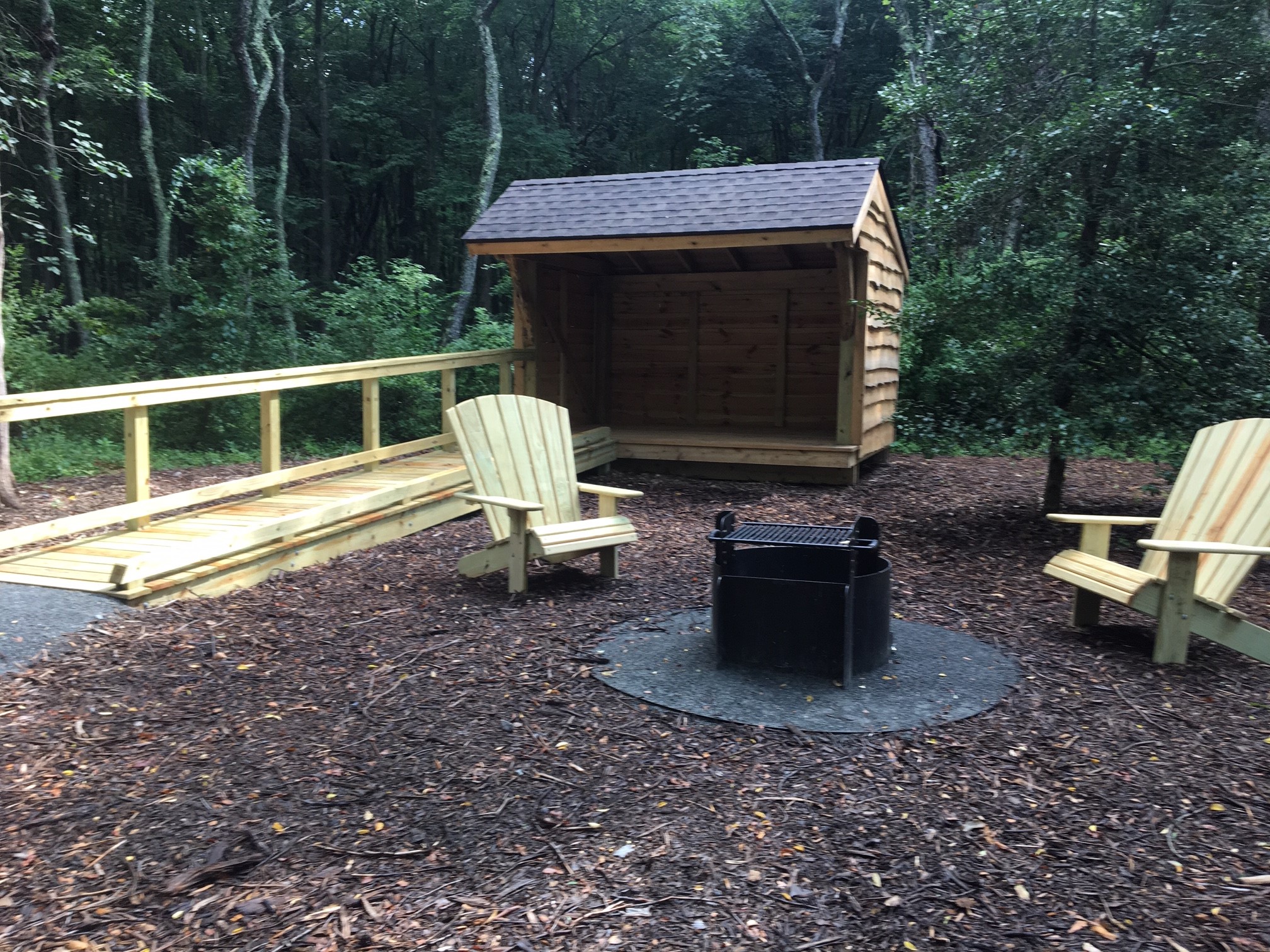 Six sites have a lean-to, essentially a three-sided cabin, for those who travel with a mattress pad and sleeping bag but no tent (or just hope to stay dry when it rains). I looked — no hooks for a hammock. One has a ramp to make it ADA-compliant.