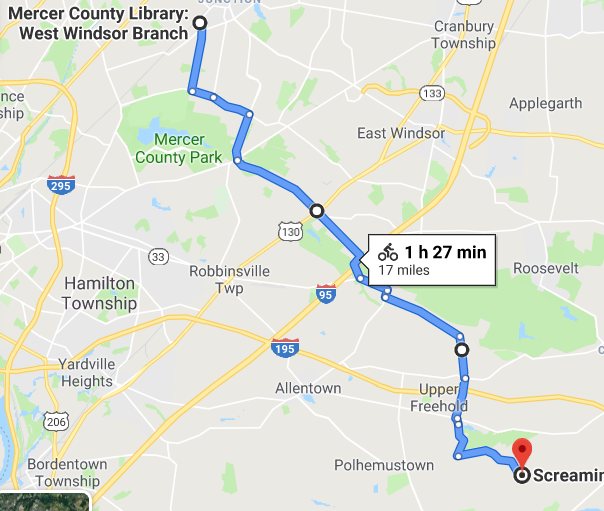 Here’s a 17-mile route from the West Windsor library (not far from the Princeton Junction train station, for those who come by train):