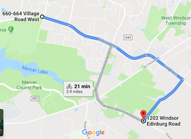 If you’d rather avoid some of Windsor Road, here’s a variation. Turn onto Village Road West from North Post Road rather than continuing straight to Conover and skirting Mercer County Park. The road becomes New Village Road, then Village Road East (sorry, but this town isn’t very imaginative with its names) to South Lane to Windsor. It’s slightly longer, but not enough to matter. Village has bike lanes but more traffic. South Lane is quiet and no bike lanes. Conover is perhaps the quietest and is more interesting, while Edinburg Road also has bike lanes. Your call.