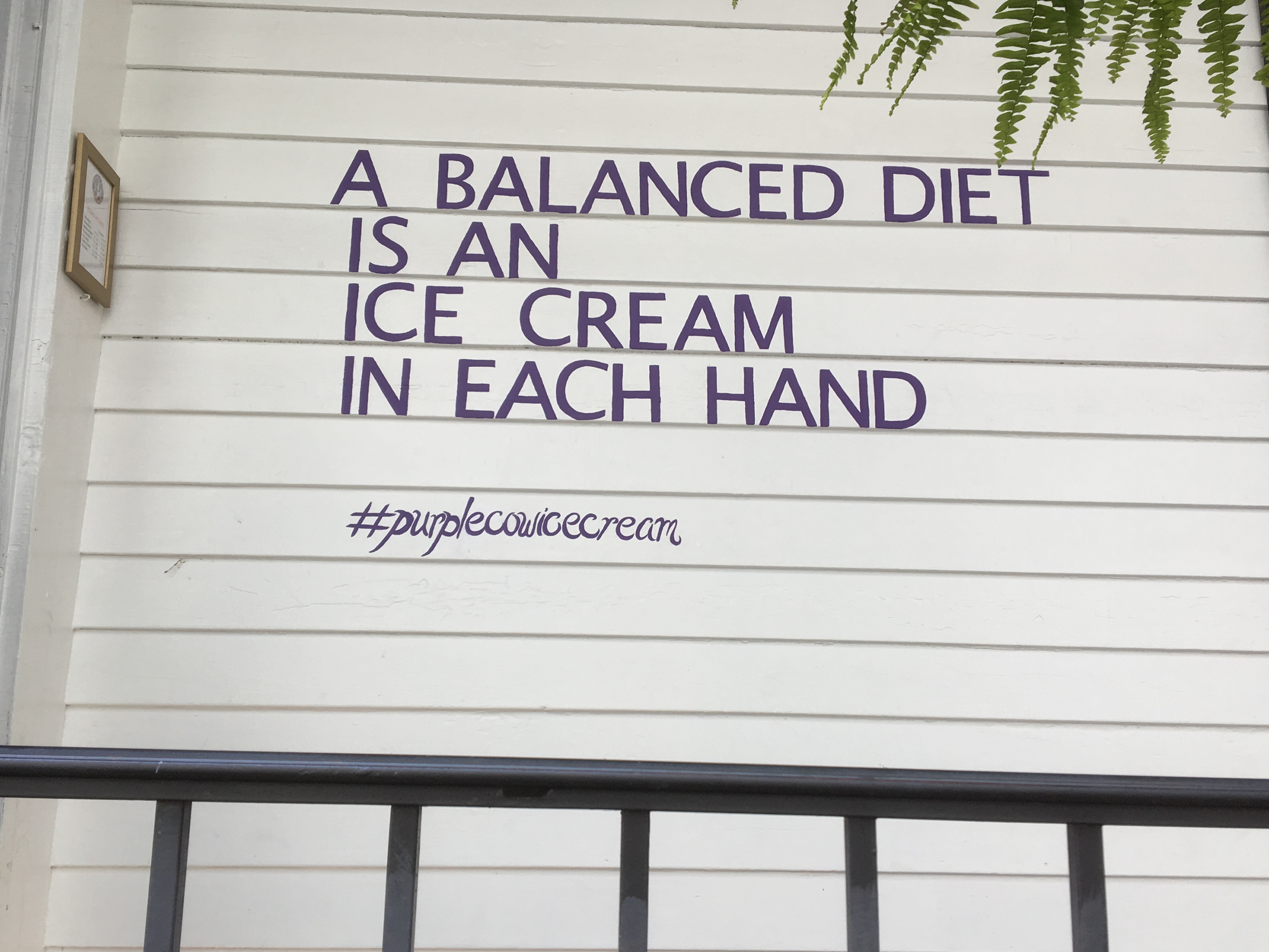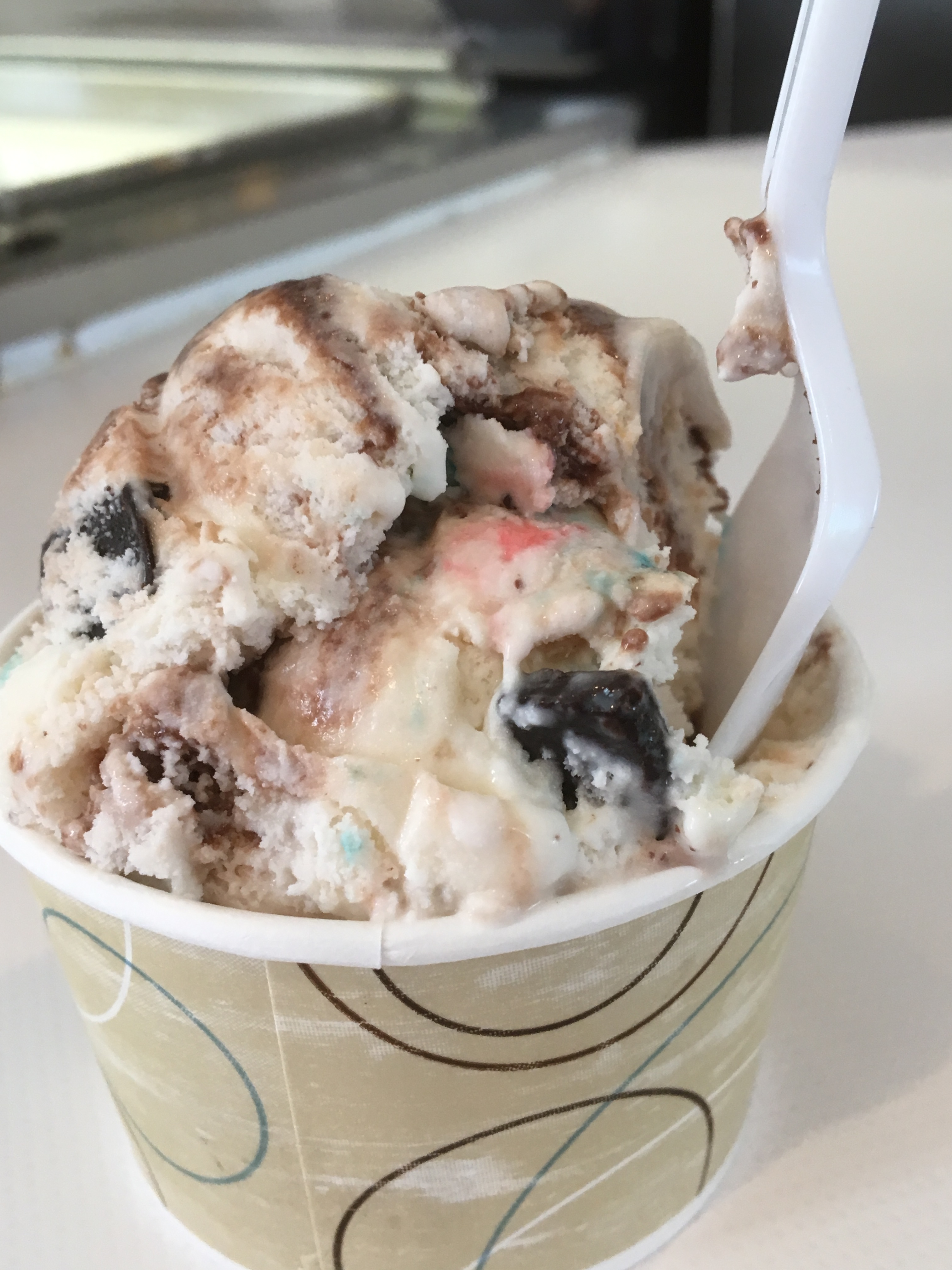 And on the way back? A stop for ice cream in Lawrenceville. The Purple Cow Ice Cream shop is just off the LHT on Main Street, and you can’t beat a generous half-scoops for just $2.50. I had come the day before on a kid-friendly ride; without them I went for a kid-friendly Holy Cow the chocolate chip cookie dough and M&Ms.