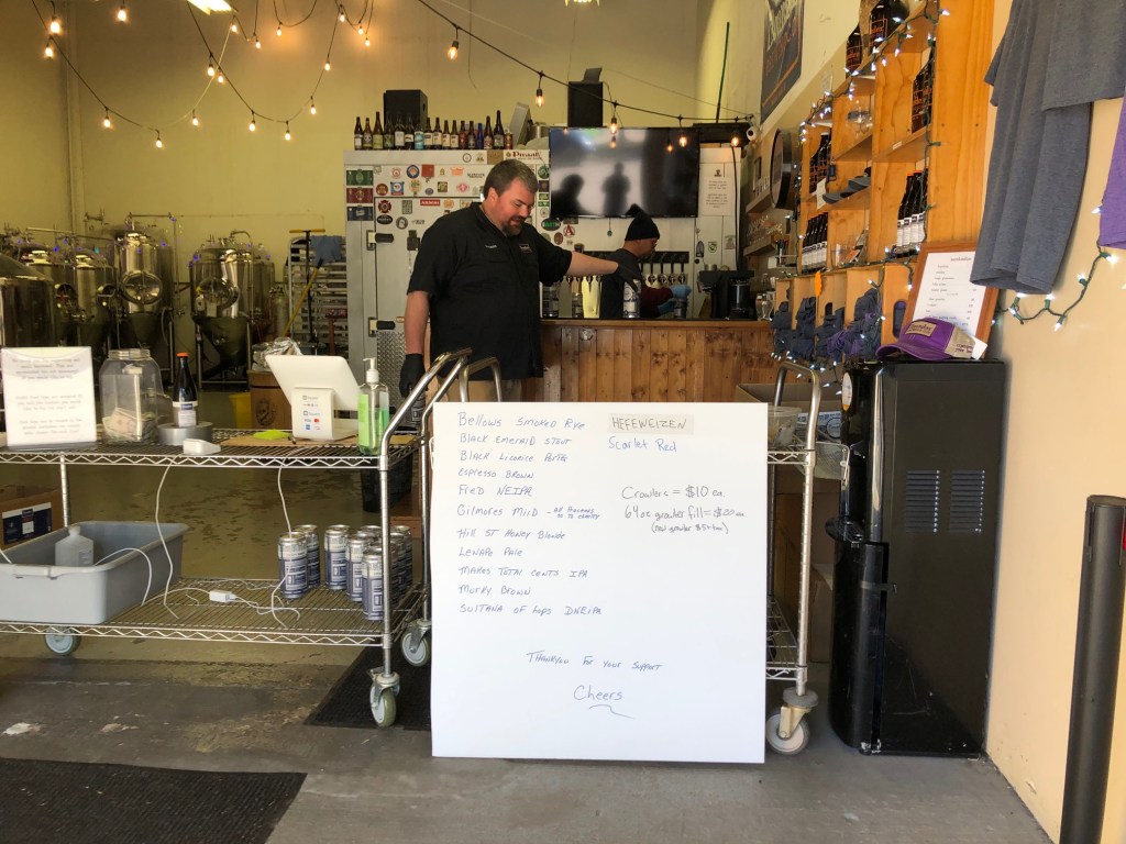 And Flounder? Open. One man stood behind the bar, filling crowlers and handing them to another man at the table in front. I guess we could have reached for the hand sanitizer before he passed our crowlers from his gloved hands to our bare ones. Paid with a chip card so no contact there.