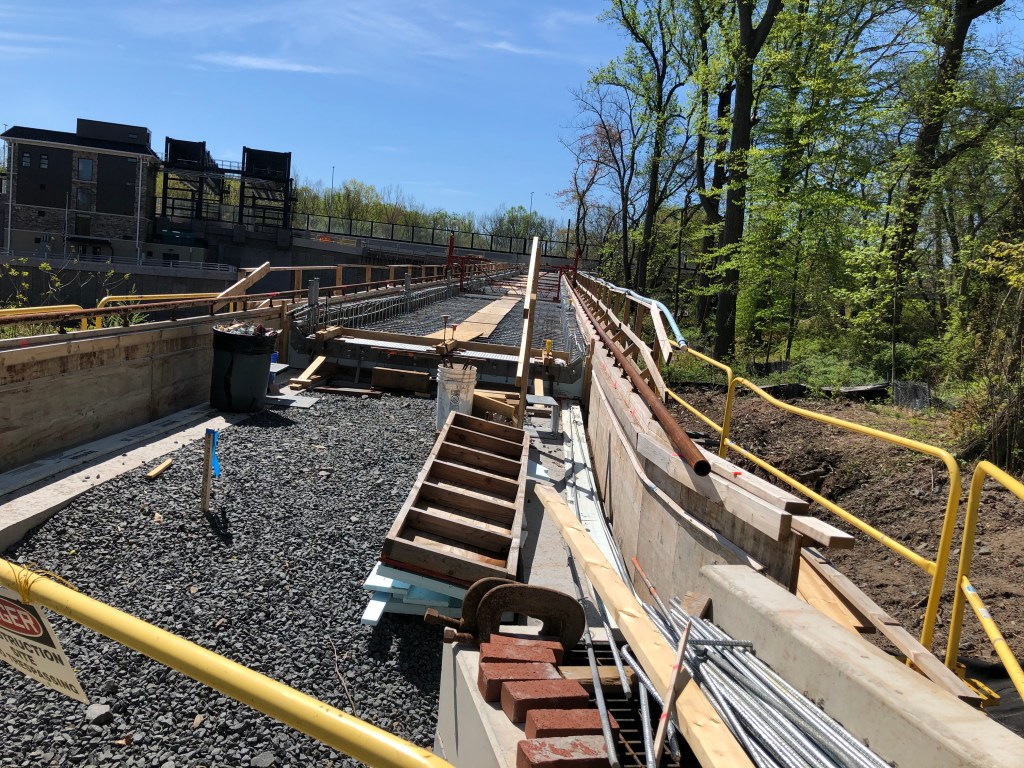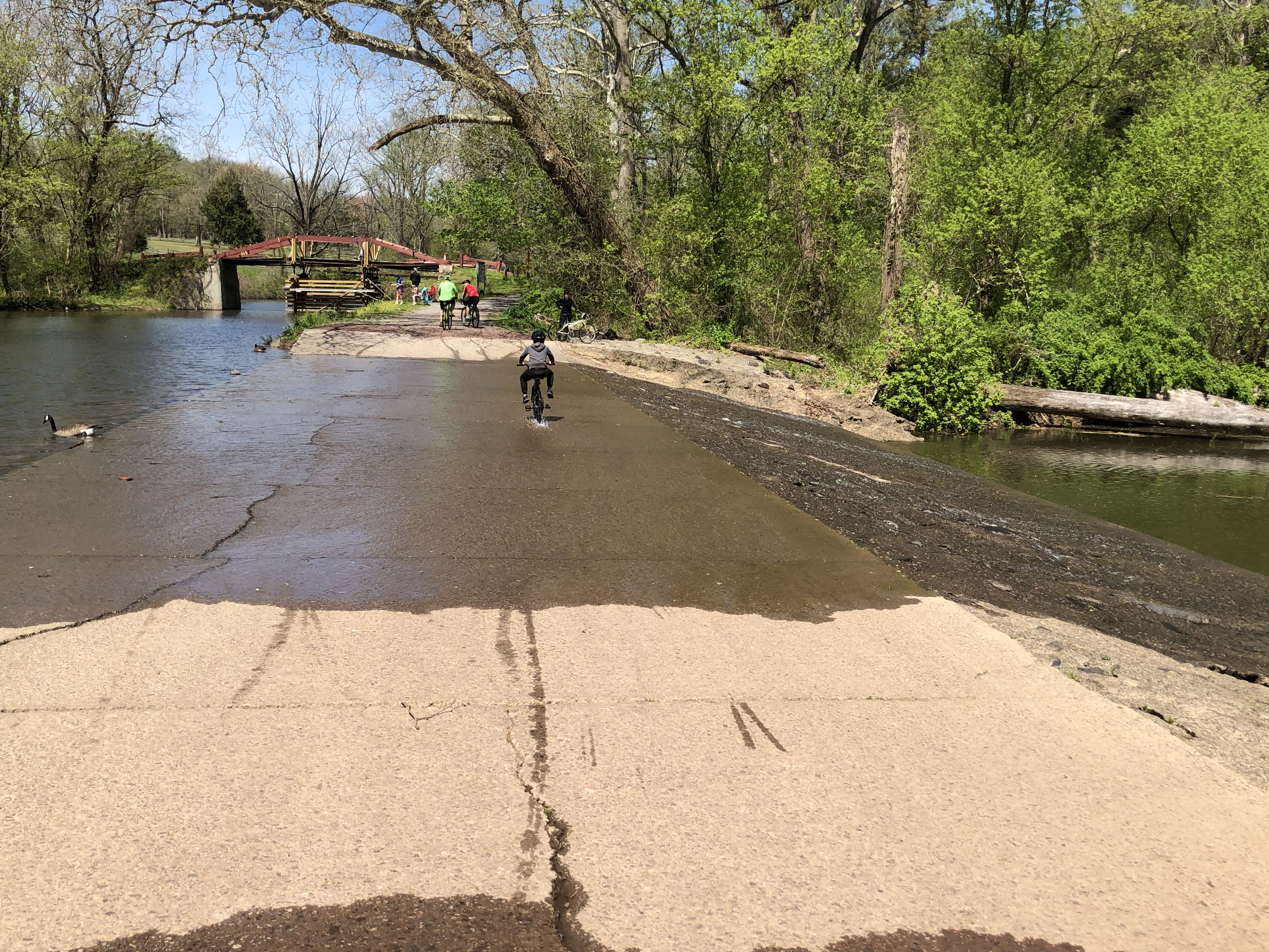 Then we dropped back down to the D&L Trail, cycling past Yardley and then under the interstate bridge under construction. It will include a bicycle and pedestrian path so of course we had to stop and check out the access ramp that’s only partially built: