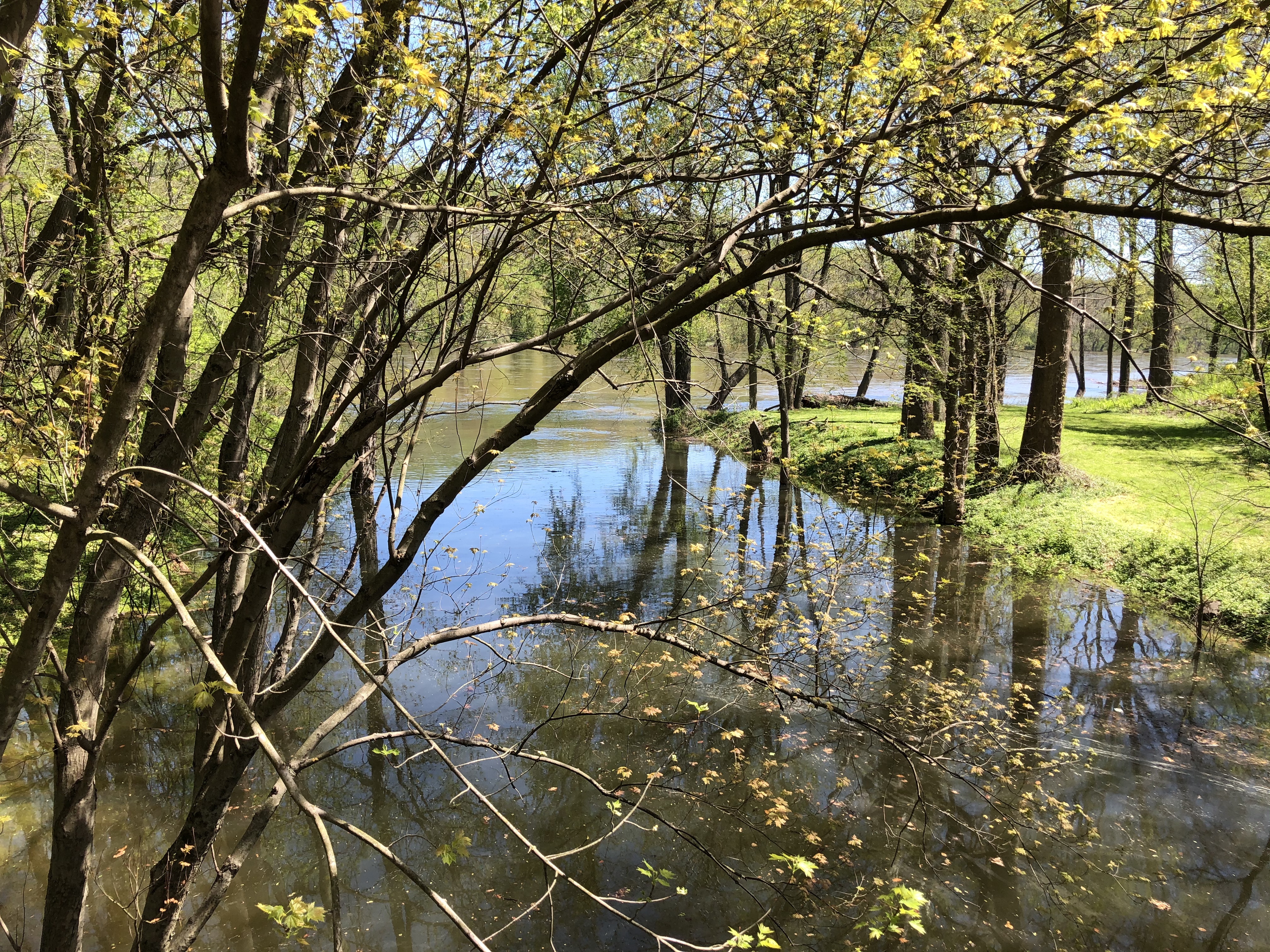 Then we walked our bikes across the bridge to New Jersey and the D&R Canal towpath. It’s a state park, and the governor had just decreed that it could reopen. To our surprise, it was less crowded than the Pennsylvania side. The trail is also wider. Add on a tailwind, and we just cruised south. Past New Jersey’s Washington Crossing, under the interstate bridge (didn’t spot the access ramp on this side), past the Trenton Country Club. Eventually we got to this sign: