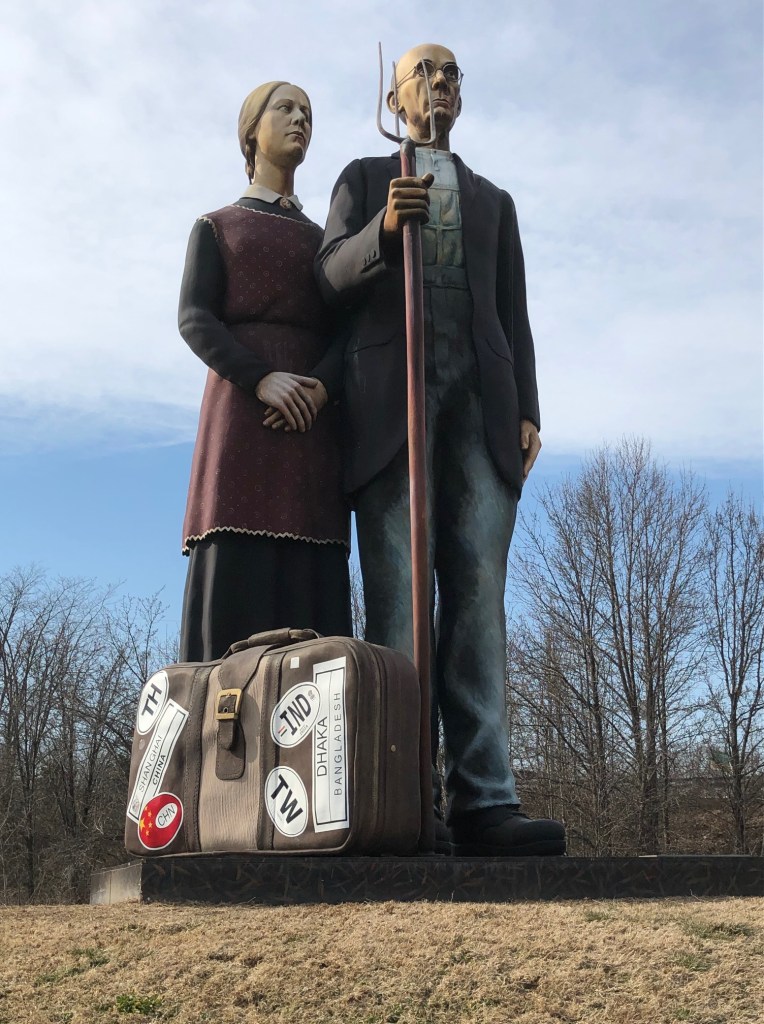 And if you’re not: take the canal towpath south, over the Route 1 bridge and across Bakers Basin Road. The next crossing is Carnegie Road. Go left here and into a quiet neighborhood. You’ll turn right onto Princeton Avenue. When you see the dead-end sign, turn left and go through American Metro. Now it gets tricky: you need to take Sloan Avenue over the railroad tracks and essentially make a big U to get on Klockner Road. This is the hairiest part because there is no bike lane on the bridge. Once you’re on Klockner, you’ll start seeing sculptures, like this take on American Gothic: