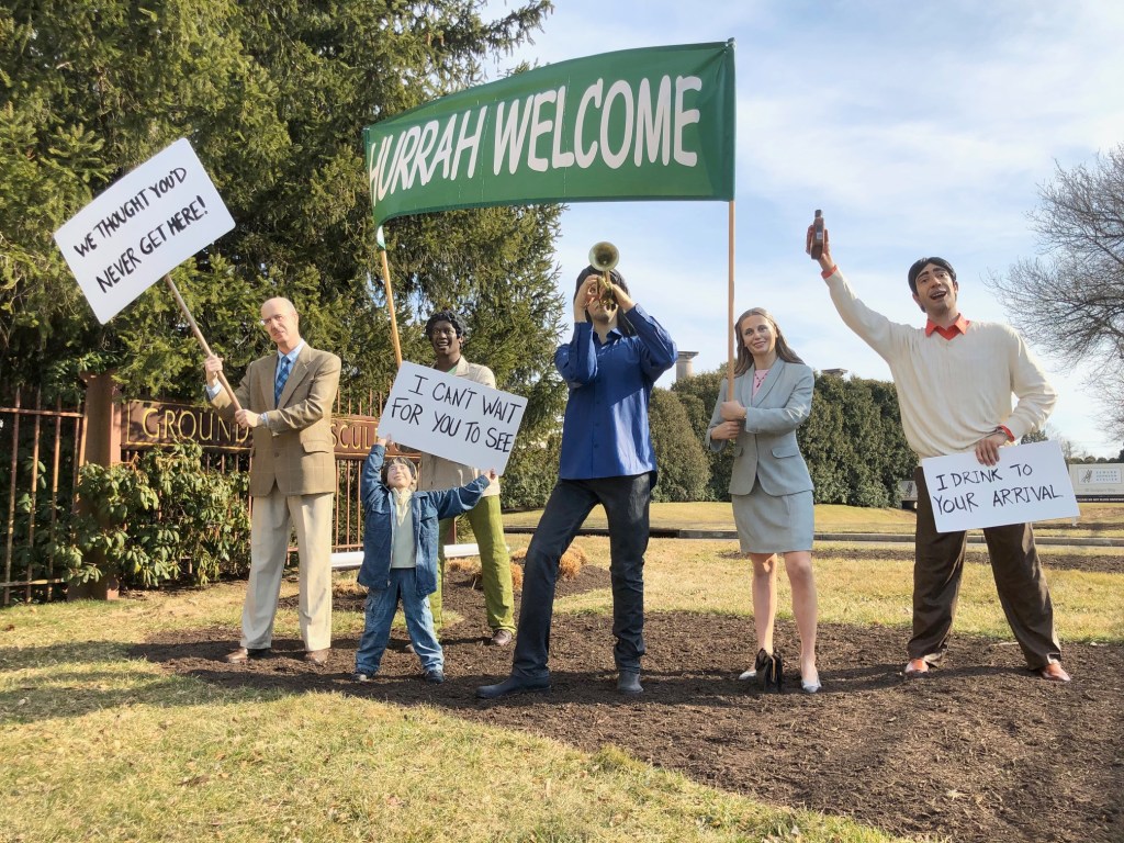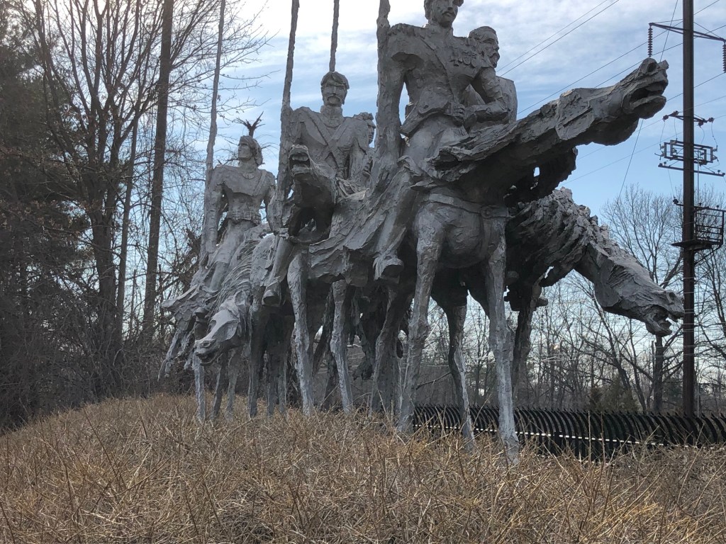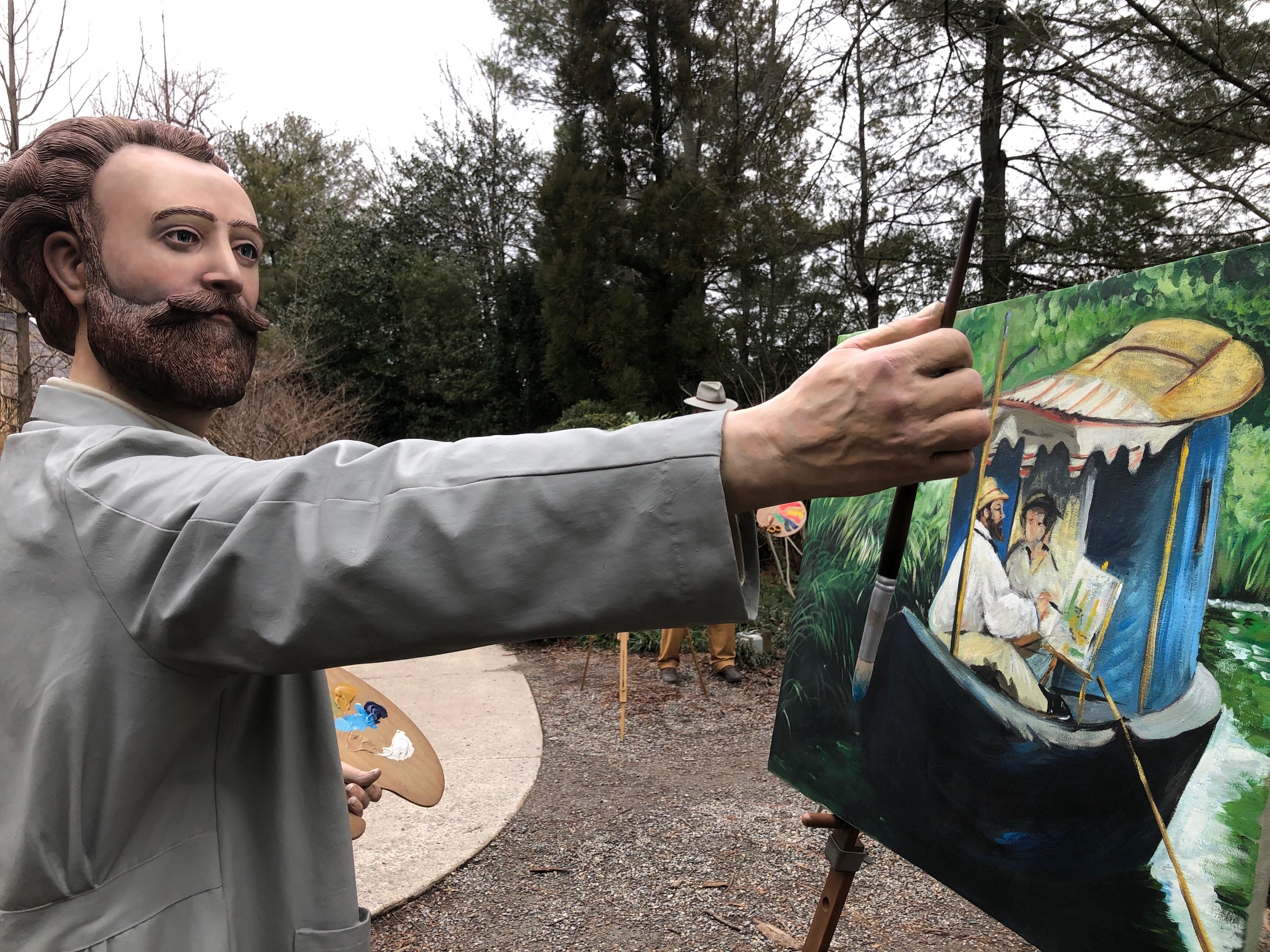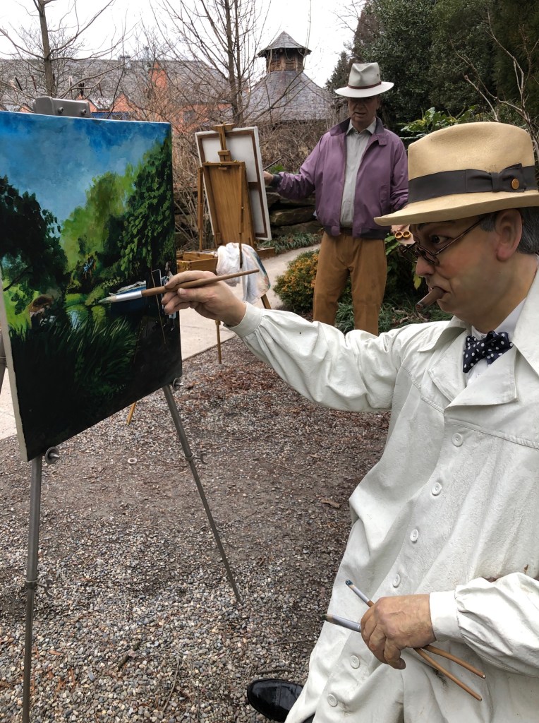 UPDATE: Some Grounds for Sculpture photos from early 2024 — painters painting painters. Seward Johnson (Grounds for Sculpture founder) is painting Winston Churchill (cigar is the giveaway) who is painting a landscape … at Grounds for Sculpture?