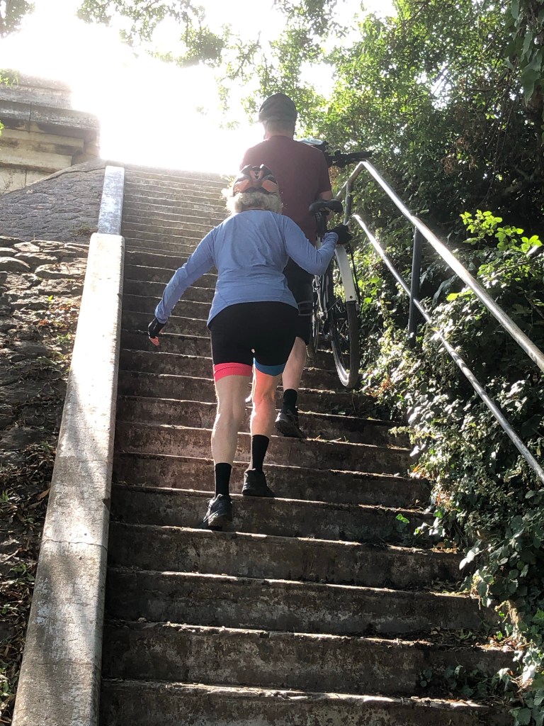 I scrambled up a long set of steep steps. There’s the canal! Crossing the river via an aqueduct. But we need to haul our bikes up those stairs? There’s no other way using, oh, a road?