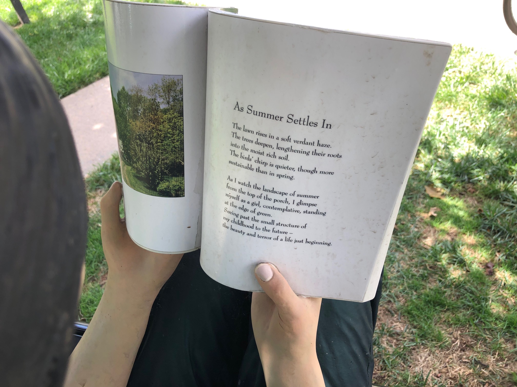 The girl on a bench reading a book? You can read what’s on the page.