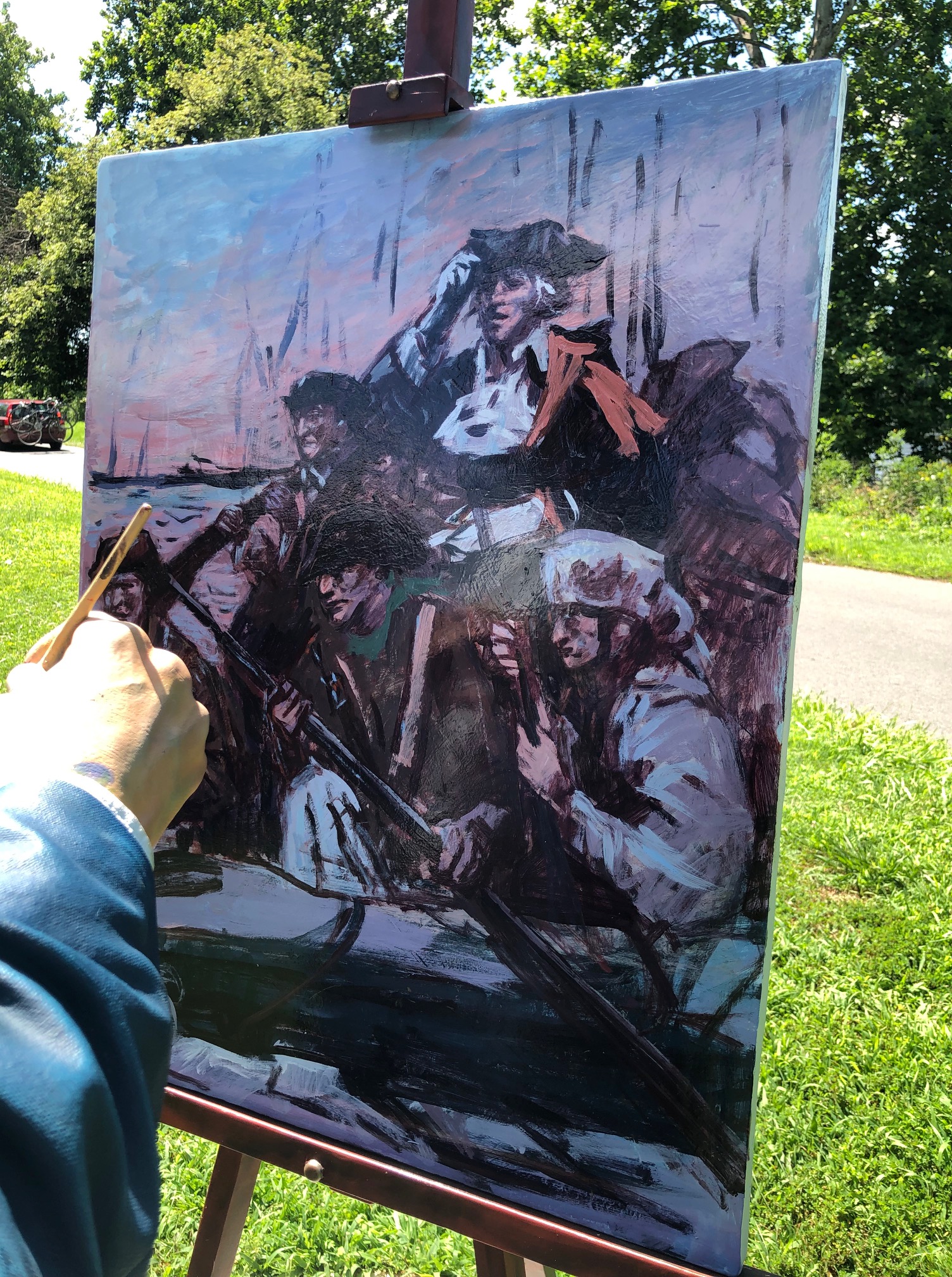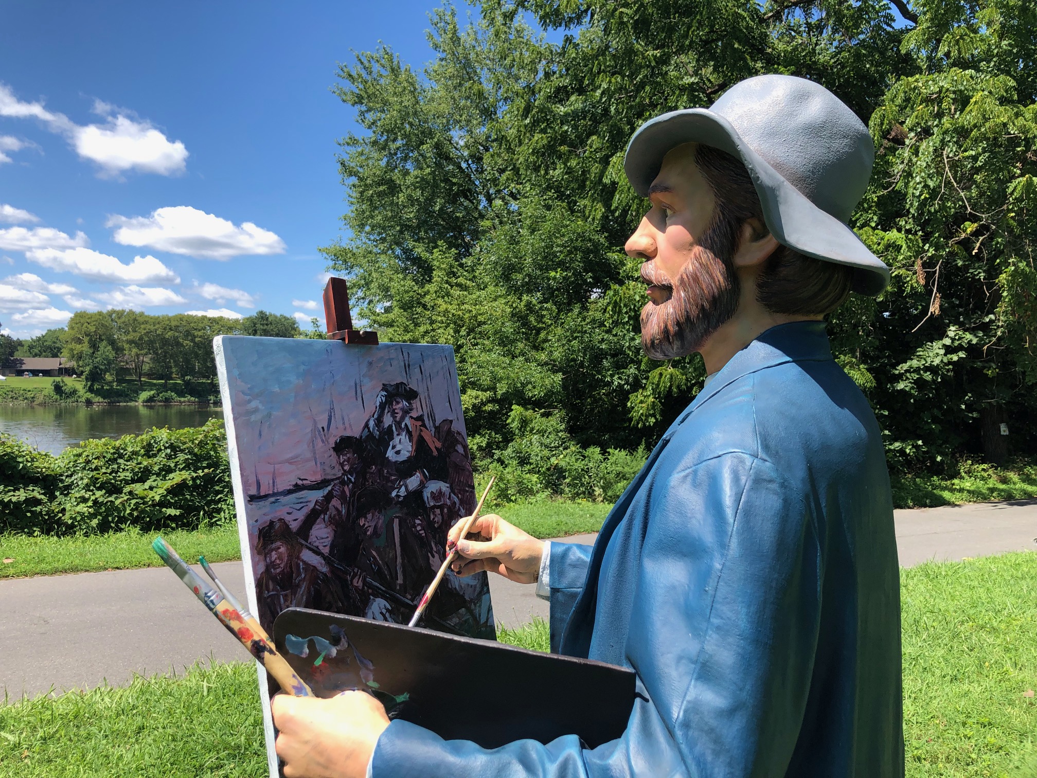 Love the painter — Monet — looking out over the Delaware River where Washington and his troops crossed the Delaware on Christmas night 1776 — and the piece he’s working on is … Washington Crossing the Delaware. (A bit of a change from the original!)