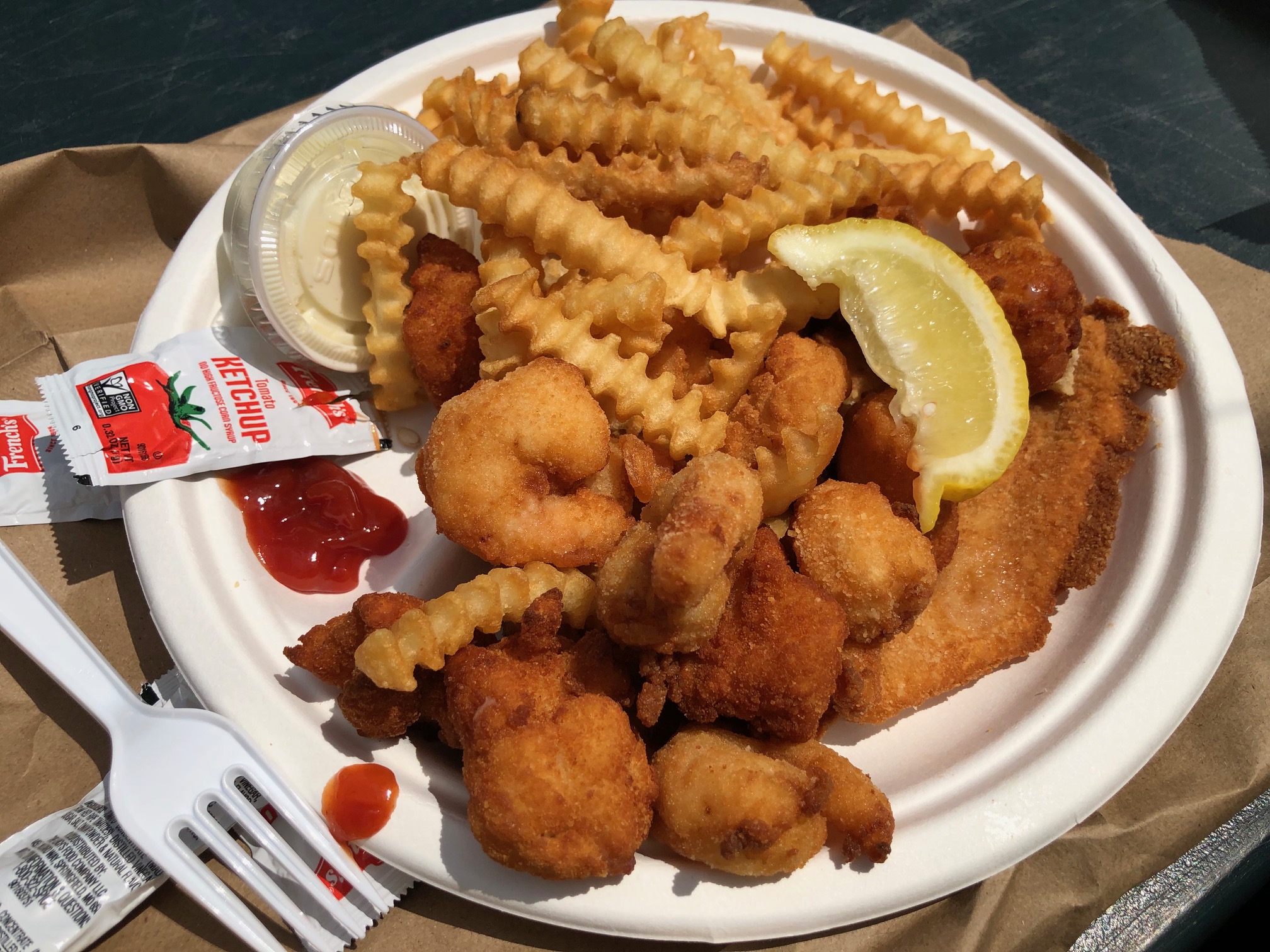 If you’re looking for food, it’ll be easier to find between Aberdeen and Highlands because you’re going through towns. Highlands has a few fish spots along the shore, such as well-known Bahrs Landing, but we headed for Keyport Fishery, which was flagged to us in a New York Times article about Keyport. We split a combination platter, all freshly fried. The scallops! Juicy! The flounder was a bit thin for a Brit used to fish and chips. It’s all take-out, so we headed to a table across the street. Also — cash only.