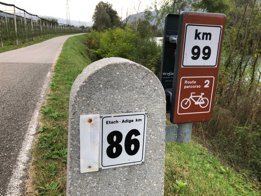 No need for a navigational device until Bolzano either. We just followed the signs. Look for a brown sign with a bike symbol. Sometimes it will say Merano?Meran, that spa town we stopped in the day before, sometimes not. White paint on the road is the backup.