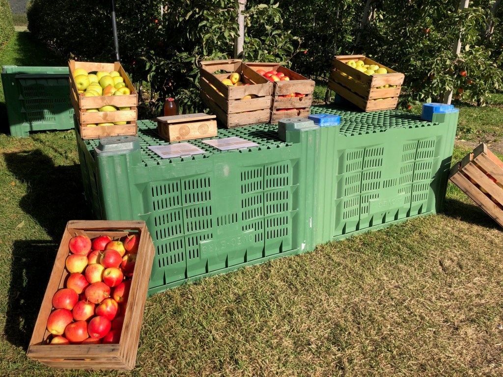 First, it’s just beautiful. The mountains, the unseasonably warm weather we experience — though this is an area that already boasts of 300 days of sunshine a year (!), however that gets calculated. Apparently the mountains on three (if not four?) sides creates an amazing microclimate … which is also why we are seeing apple orchards for miles on both sides of the path. Farmers grow 11 varieties of apples totaling 5 billion (yes, with a b) apples in South Tyrol. We’ve arrived in the middle of the harvest.