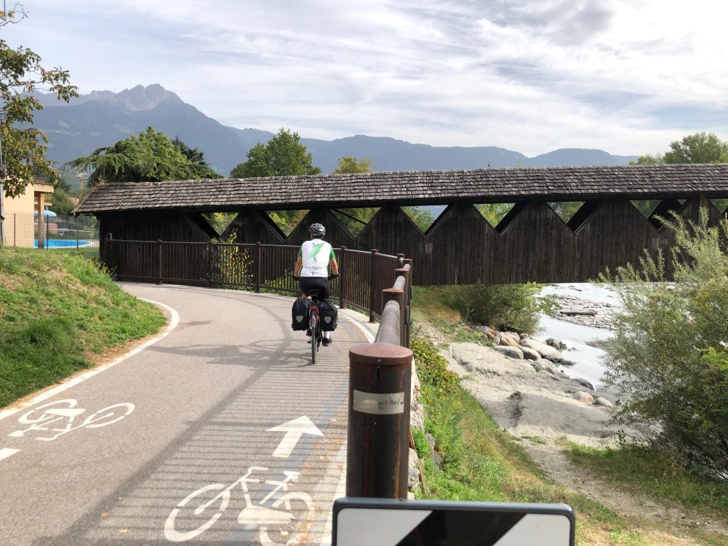 We reach the outskirts of Bolzano, which describes itself as a bike city. We turn off our path and onto another one, along the Eisack River, signposted for Bolzano. Then we turn on the navigational help, which gets us from this path through the heart of town and to our AirBnB.