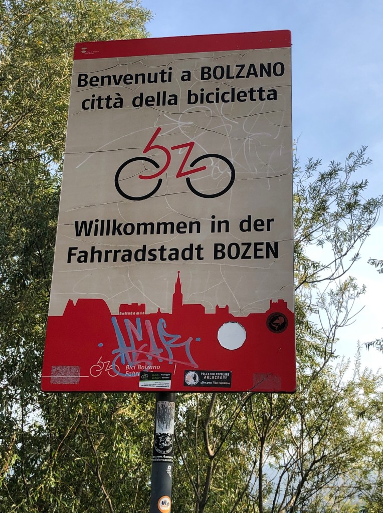 We finally reach Merano (Meran to the German speakers) after about 60 km, or 36 miles. The wayfinding signs turn red, like the ones we saw in the town the day before, and we watch for those saying Bolzano/Bozen. This is still a predominantly German-speaking area, though we’re told that it’s more evenly divided in Bolzano, perhaps 24 miles away.