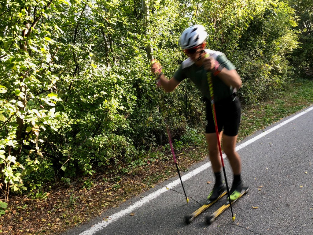Who else goes uphill? People training for the cross-country ski season. We were caught off-guard when a pack zoomed past us. But I was later able to snap a photo of this one: