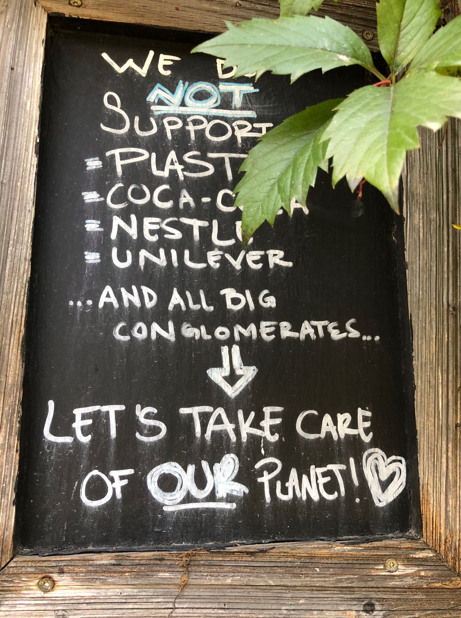 We’re also discovering this idea of bike bars along the trail — food and drink, not necessarily alcoholic. Outdoor seating. Green space too. They make me think of what you might find at the bottom of the ski slopes. This one, called the Radbar (Rad=bike in German), was clear about its beliefs.
