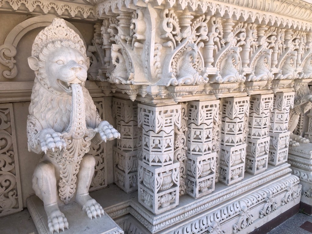 Do take the time to talk to at least one of the many volunteers. I met one who drives from Parsippany ( 1 1/2 hours each way if there’s no traffic) three times a week. She pointed out an amazing carving, all from one piece of marble, in the ceiling above us in the Mandir and explained what it represents.