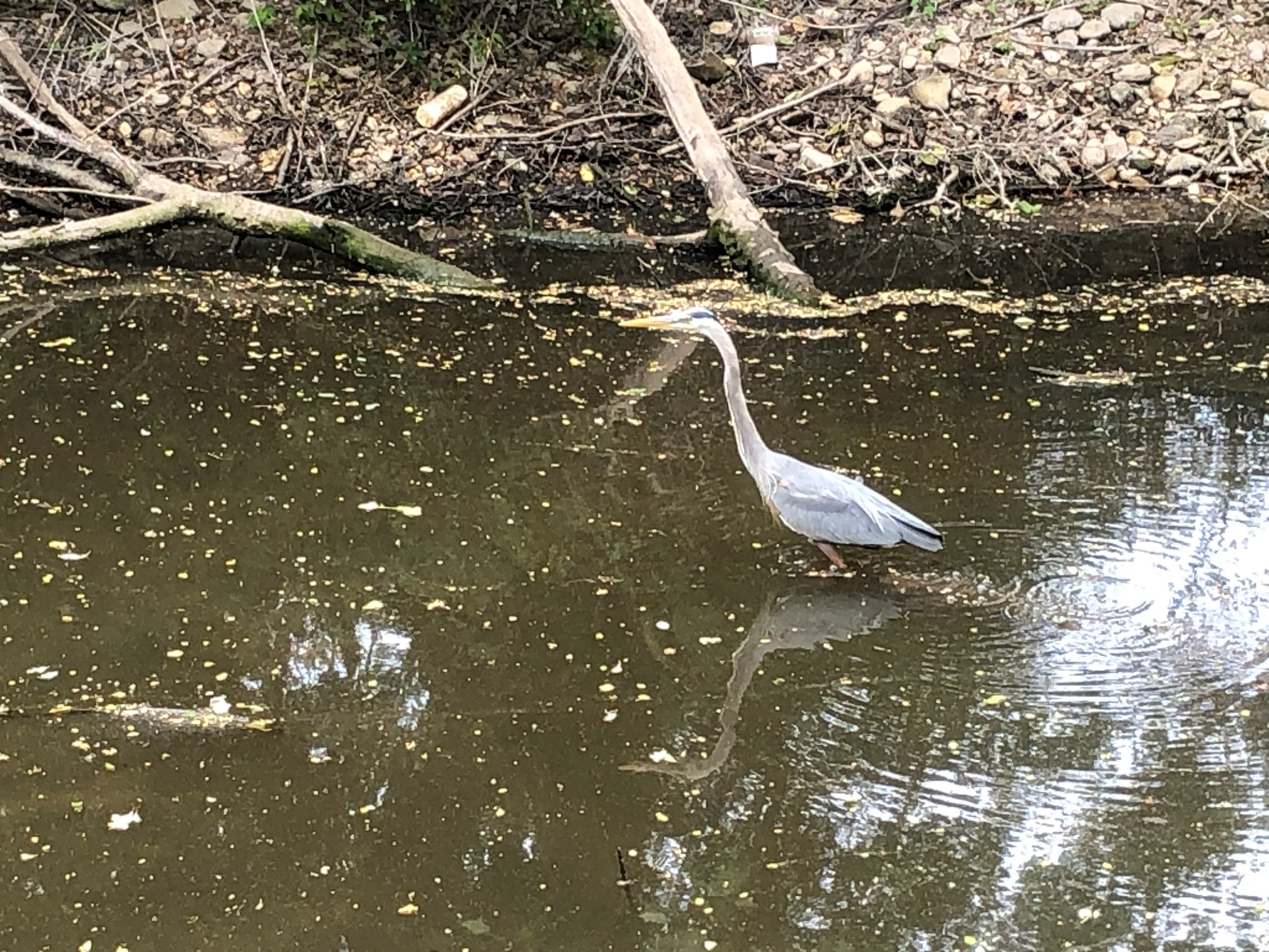 The trail: mostly tranquil, occasionally interrupted by the sounds of Amtrak trains nearby. Oh yeah, and those two teenage boys who roared by on ATVs at one point. A blue heron patiently stood knee-deep or so (do herons have knees?) in the Delaware Canal’s water posing for my photos. The towpath surface is mostly a red clay, so a bit muddy in spots when it’s just rained.