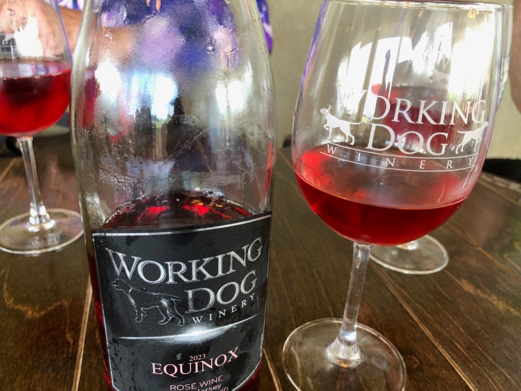 Across U.S. 130 and a couple of “hills” — including the Turnpike overpass. Then left onto Allens Road and shade. A slight right halfway through our ride and we are at Working Dog Winery in East Windsor — or is it Hightstown?