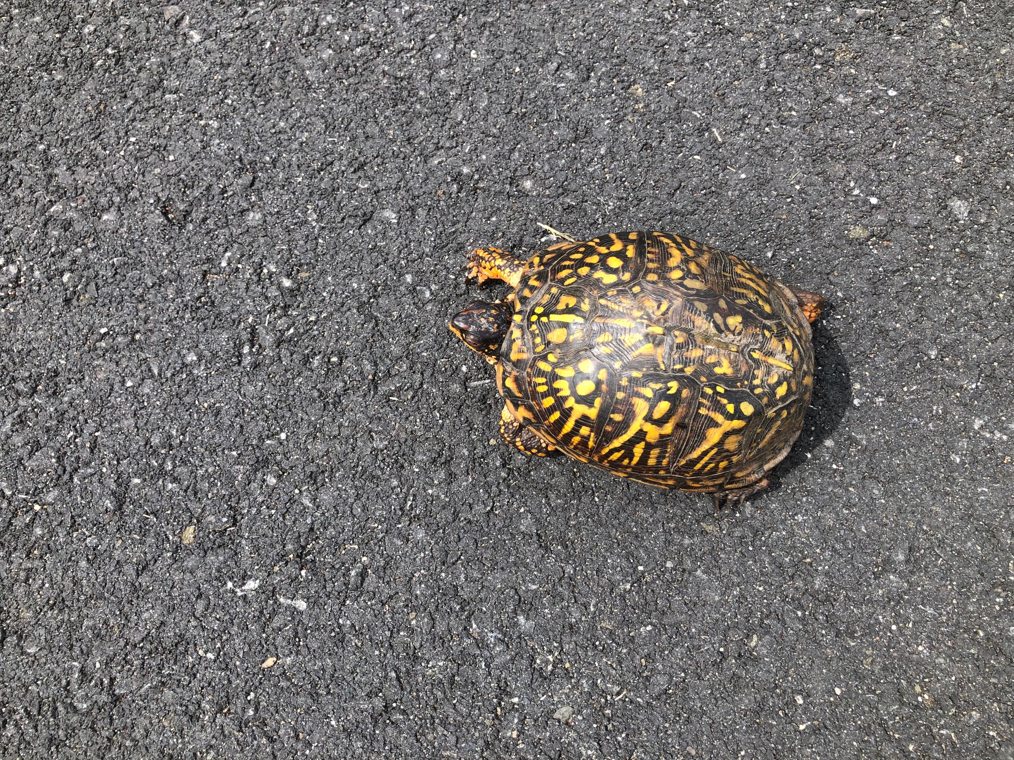 First time for me to see a horse and rider on the trail, and nowhere near the county equestrian center to boot. The turtle just wanted to cross the trail.