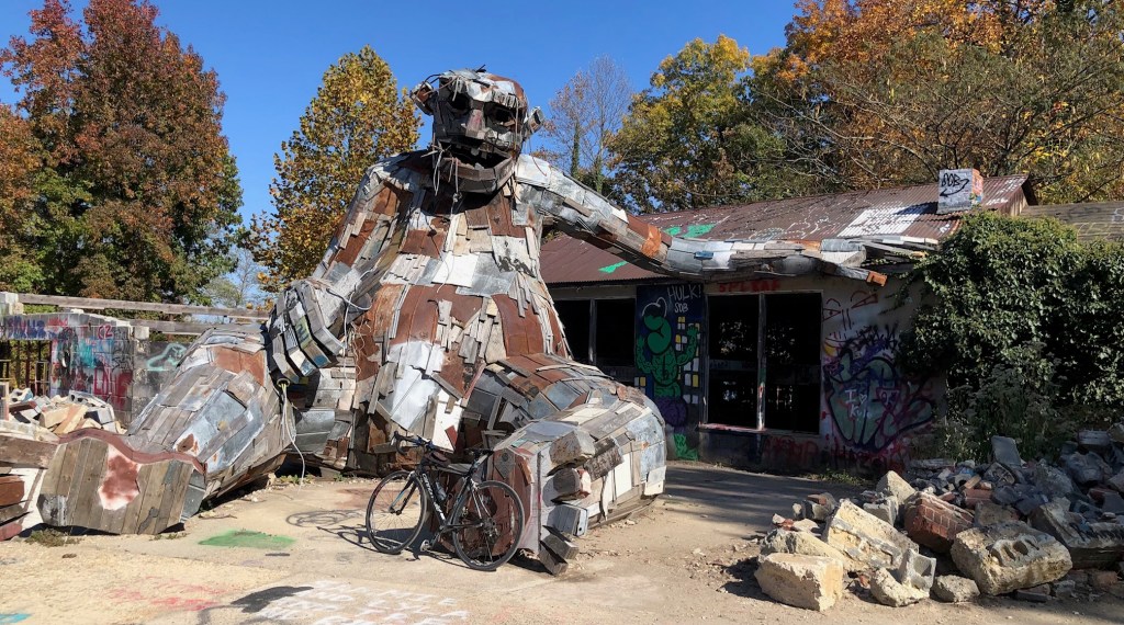 Next we headed to Historic Smithville Park. This was once home a bicycle manufacturer, so of course I loved that Troll on a Stroll was made of bike parts!