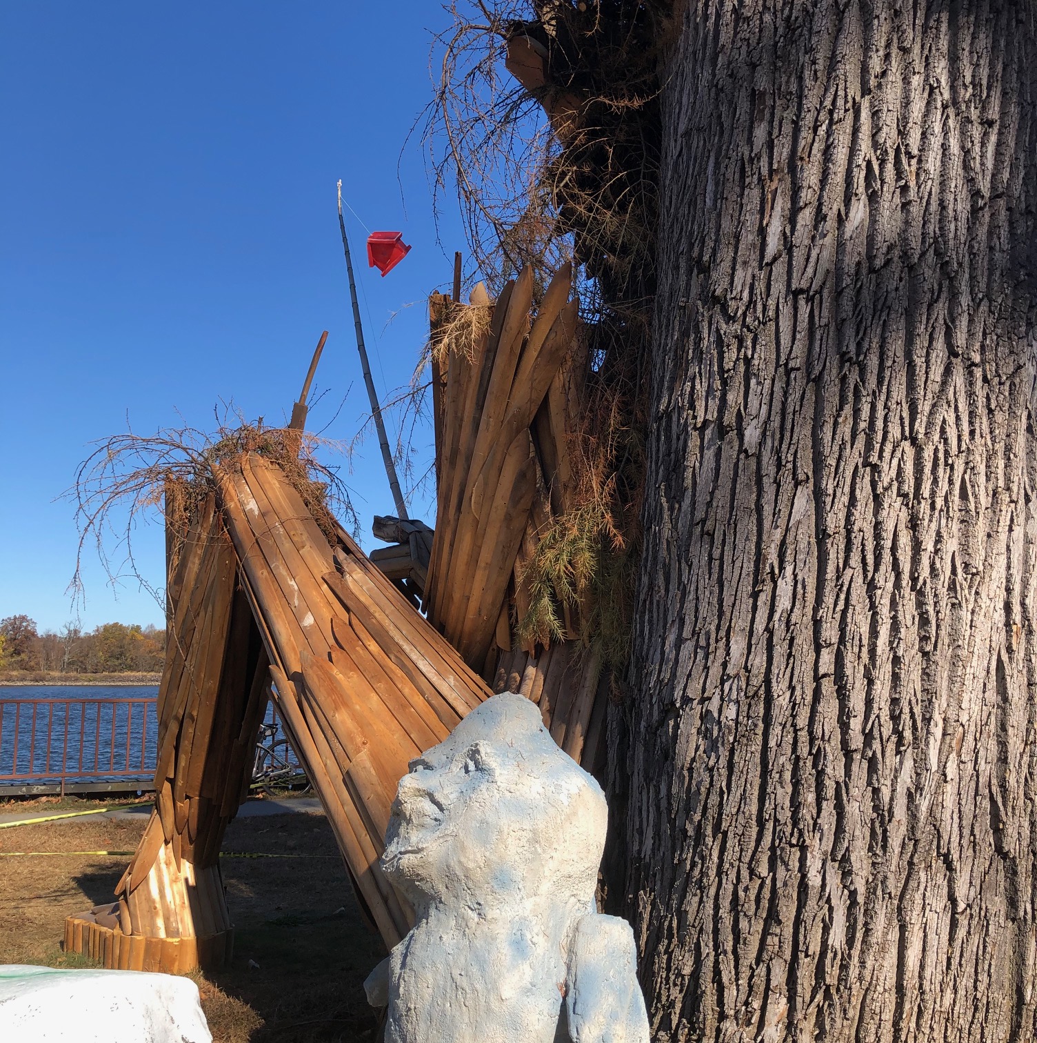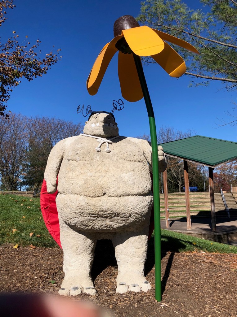 After cutting through a neighborhood, we discovered Woody, hiding in the woods of the Rancocas Nature Center. Clearly there’s a reference to the woods there, but I think there’s also a hat tip to Woody Guthrie.