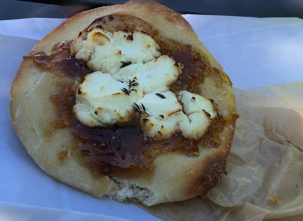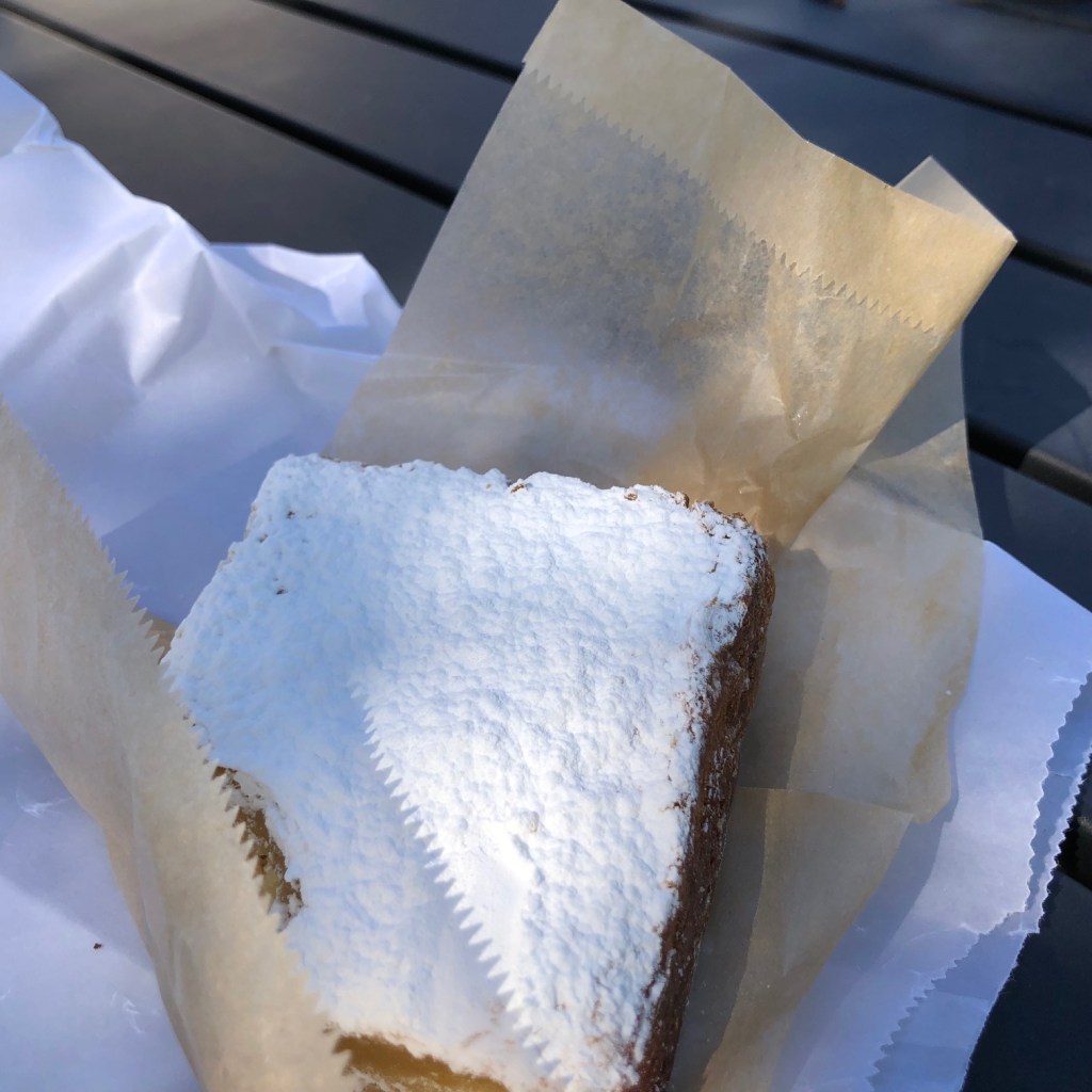 Everyone else went for something savory (that fig and goat cheese Bialy — sort of a flattened, fluffier bagel — got some nods, and a tiny nibble from me). But I’d been told by a fan of the lemon bars that I absolutely, absolutely had to get one. So I did. Dusted with powered sugar, it was more sweet than tart.