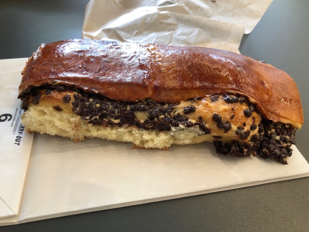 NJ.com recommends the chocolate almond croissant, but I only saw almond ones. A chocolate brioche, smothered inside with mini chocolate chips and ooey-not-gooey, sounded right.