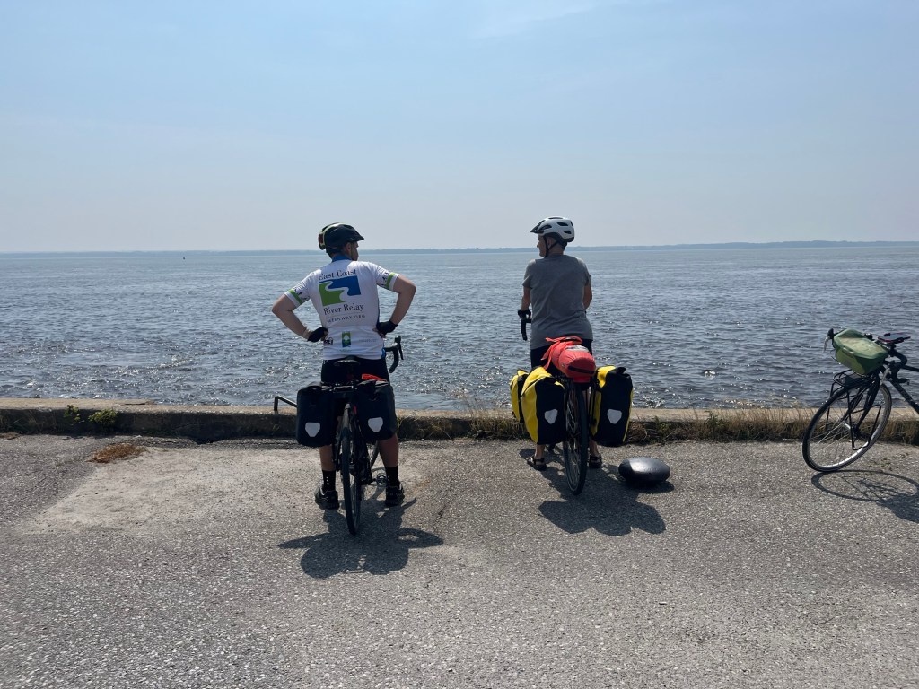 At least we saw cyclists loaded with panniers coming toward us. A sign that the bridge detour is real? And then the detour ended right by the bridge — do we go look? After all, it’s academic at this point. Ah, we hear construction noise! OK, we can accept that those extra miles in the heat were legit.
