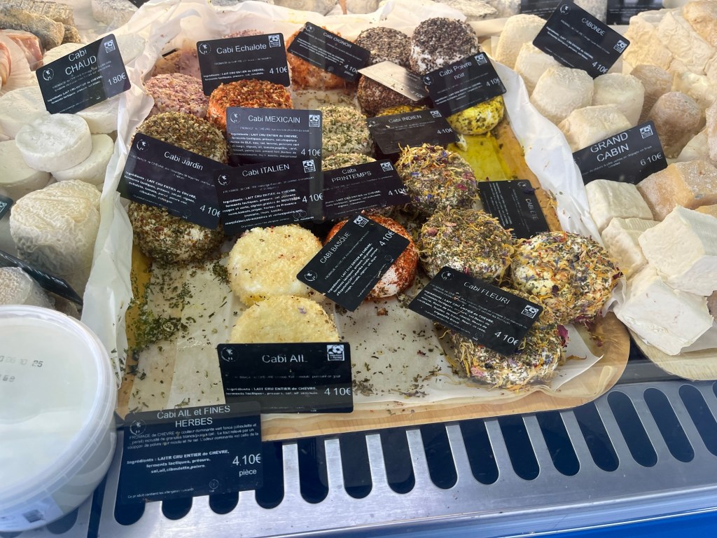 But as we head out … another market. A food one! A man holds out a paper-thin slice of cheese — a present, he says. I stop and decide to sample the charcuterie. He proudly explains that the one made from wild boar has won a gold medal at a sausage competition in Lyon. All natural. But no, the stuffed wild boar’s head adorning his table is not one he shot, just something he bought in a store.
