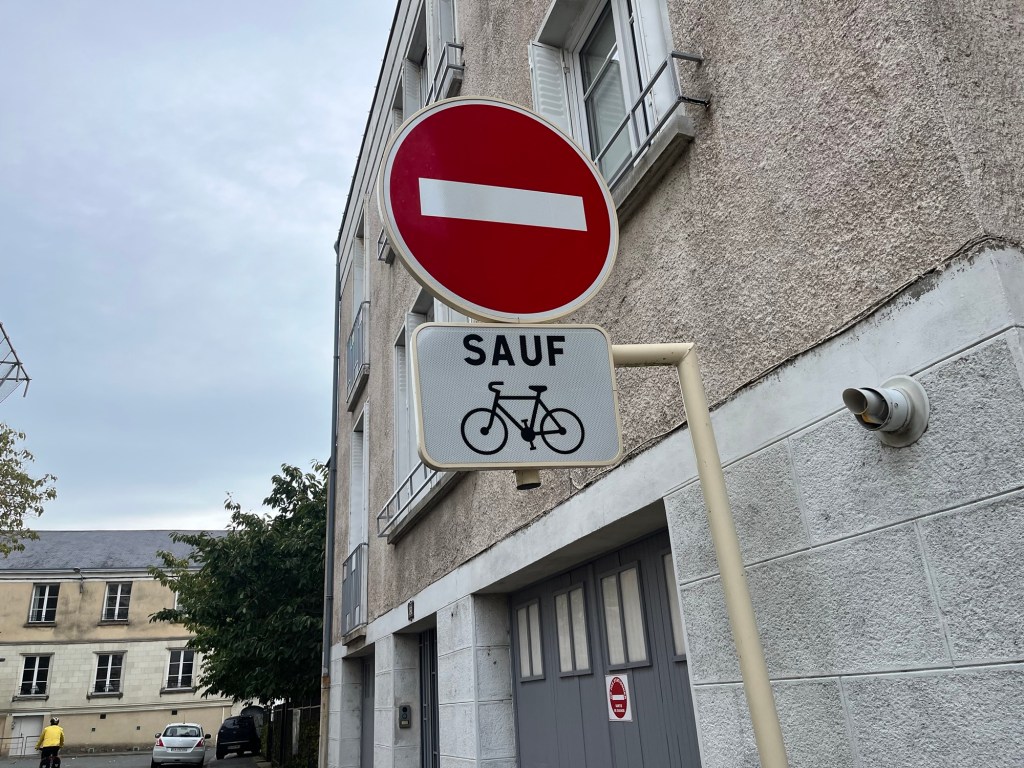Take, for example, the photo at the top. We saw this all over Tours, in Saumur … basically on lots of one-way streets. That red circle with the white bar is the European symbol for one way, do not enter. And then there is that second sign: except bicycles.