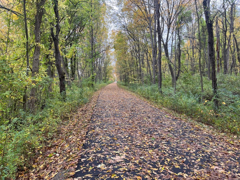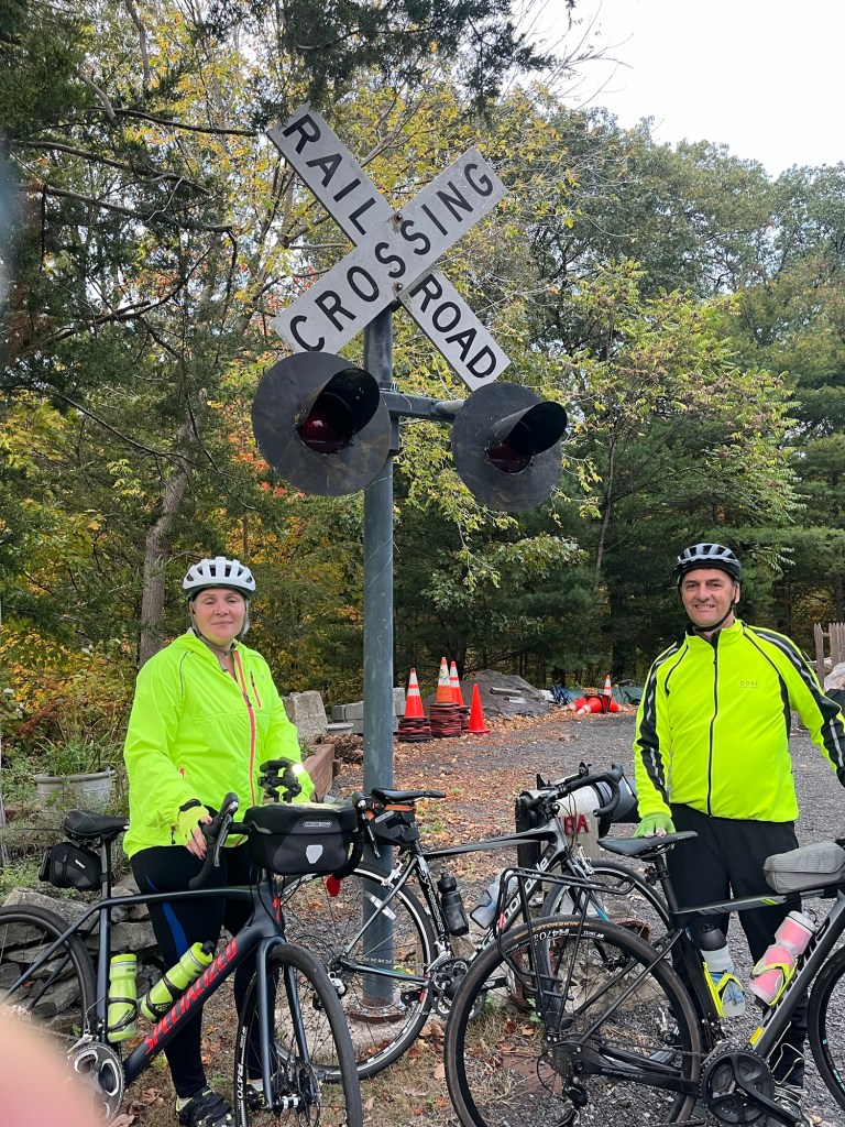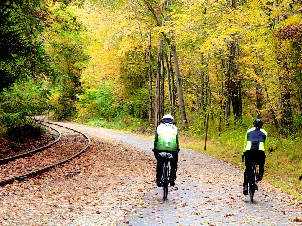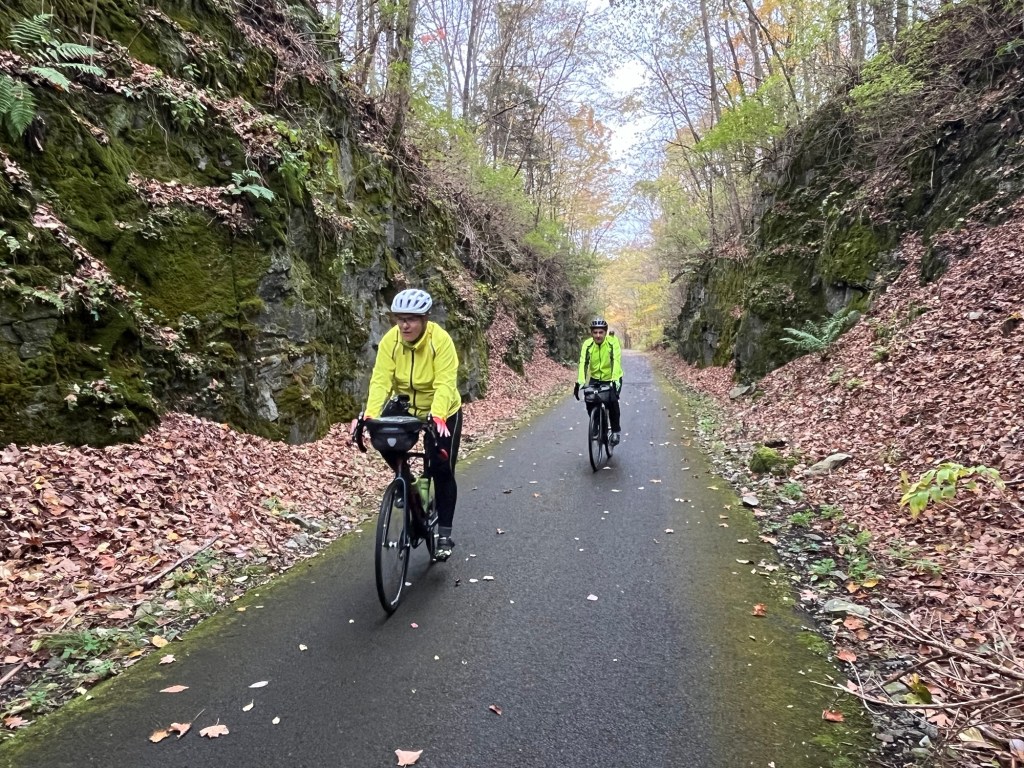 And this time we had the red, orange and gold in the trees, leaves falling on our helmets as we rode by and others carpeting the pavement on the rail-trail. Except for when trail staff blew leaves off the trail — who knew that happened?