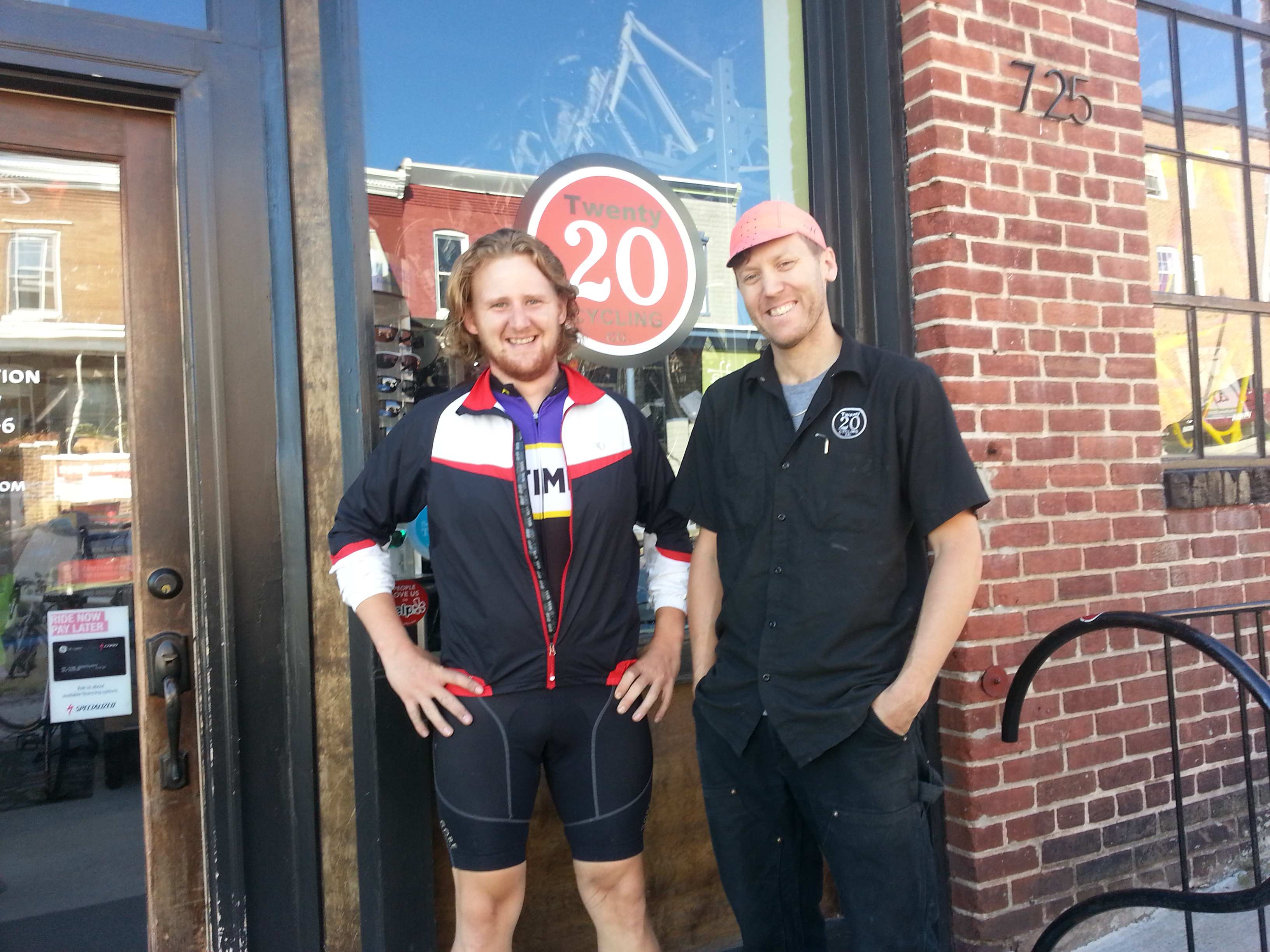 So Ross hit the brakes, came over and took charge. Turns out he’s a bike mechanic (and full-time student and on a local racing team), and he diagnosed the problem behind the flat in an instant. This bike clearly needed new tires if it was going to get its rider to Fredericksburg. Ross got the bike rideable and we headed to the shop where he works (which wasn’t supposed to open for at least another 90 minutes). Between him and Mike, we were back in business pretty quickly. Better yet, we were only a few blocks off the East Coast Greenway route.