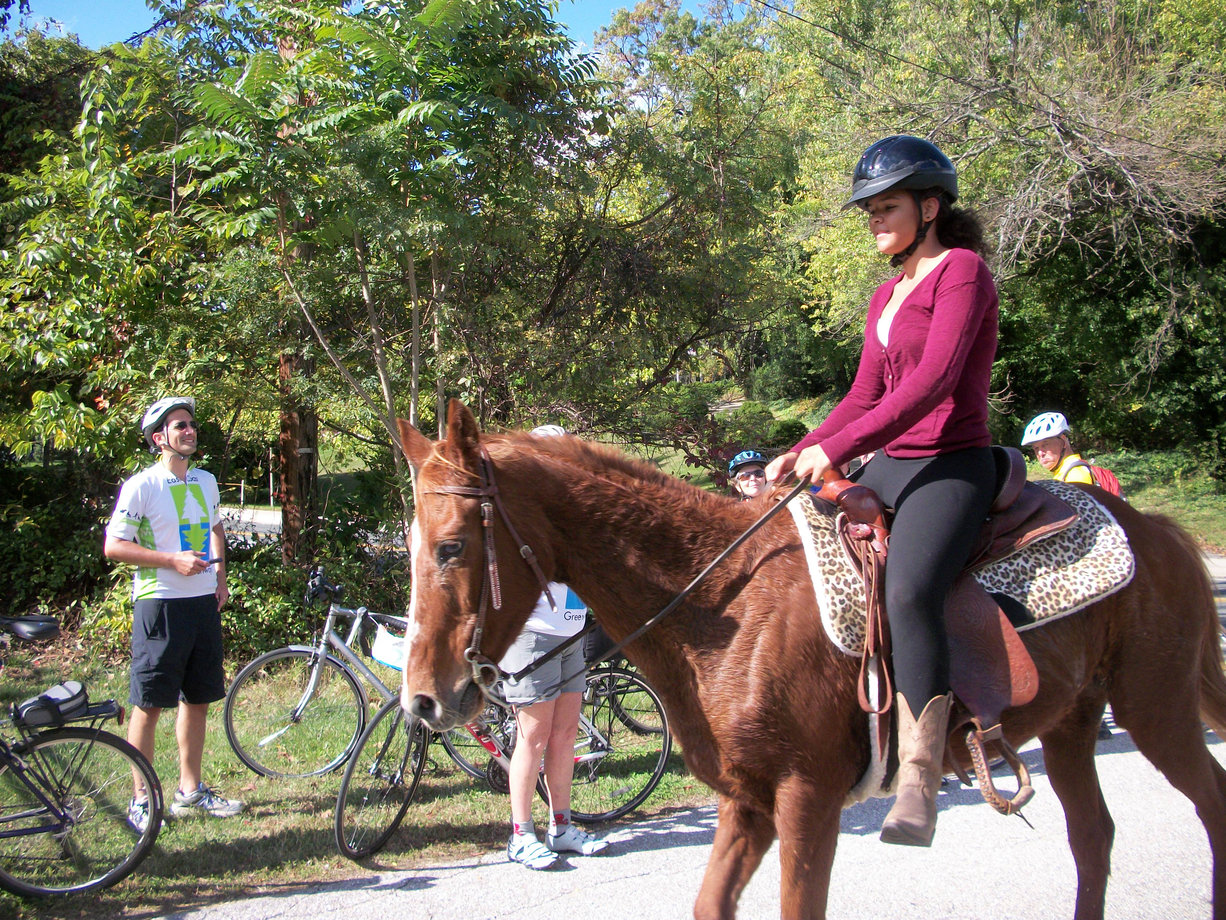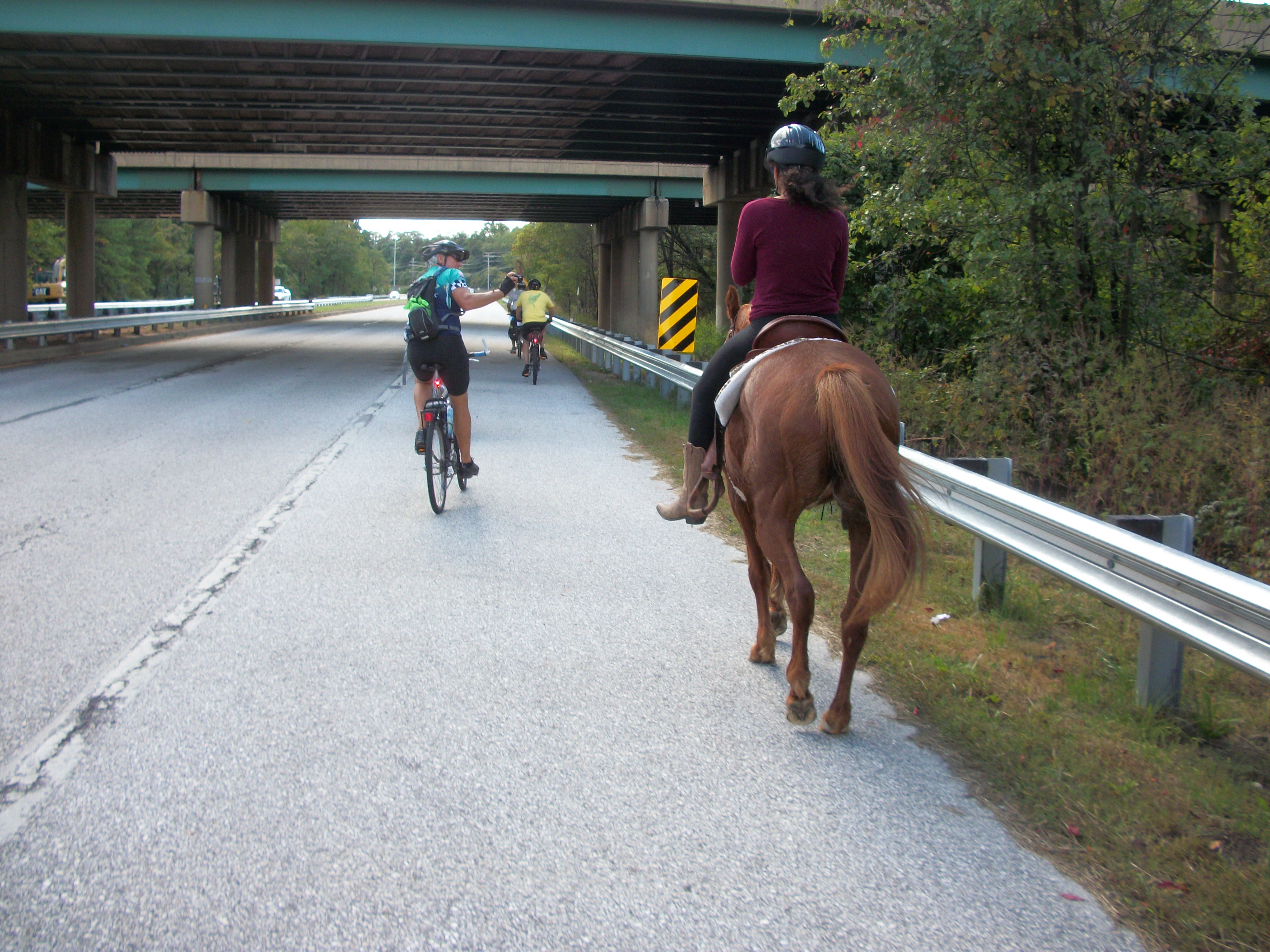 We first came across this young woman and her horse on Maryland 170 (also known there as North Camp Meade Road) as we all had to cross a not-busy on-ramp to Interstate 695. When we came across her the second time, she said she had taken the horse to her house about a 30 minute walk away – just because – and was now taking her back to the stable.