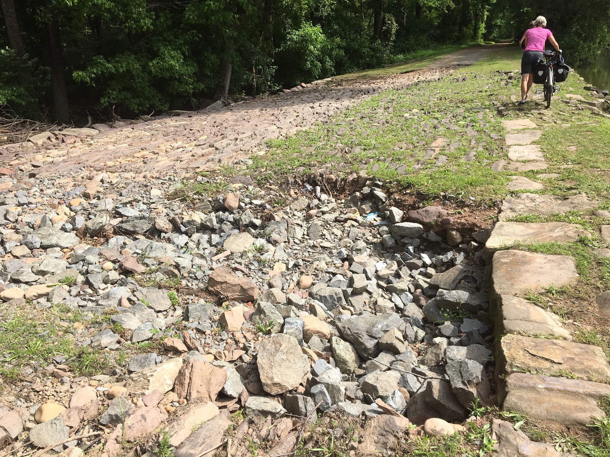 The surface varied. Parts were badly rutted: The canal had overflowed in some spots during recent heavy rains, washing away a coating of pebbles and exposing jagged spillway stones that our bikes weren’t happy about. Lisa’s front handlebar bag jostled loose at one point, and we couldn’t get the screw to reattach. Other damage probably dated back to some nasty Nor’easters in March. But as we moved further north, past East Millstone, the surface was smooth and we could lose ourselves in conversation rather than dodging potholes and puddles.
