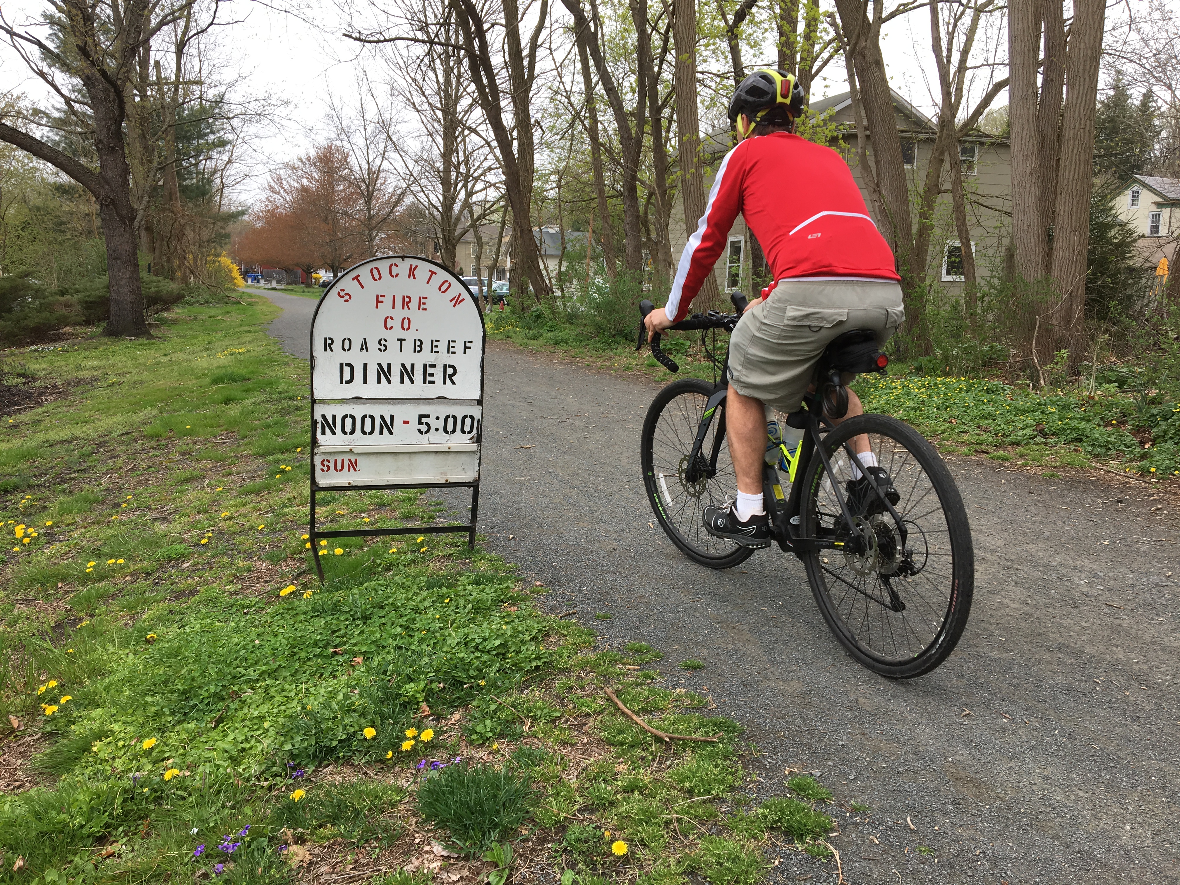 Stockton is along the Delaware River, and we’ve ridden both the D&R Canal on the Jersey side and the D&L Trail on the Pennsylvania side. (We picked up lunch here on our bike ride to watch polo last fall, for example.) This time, though, we weren’t going to take it easy with a flat ride. Instead we picked out a ride posted on Ride With GPS that took us into the hills on both sides of the Delaware River.