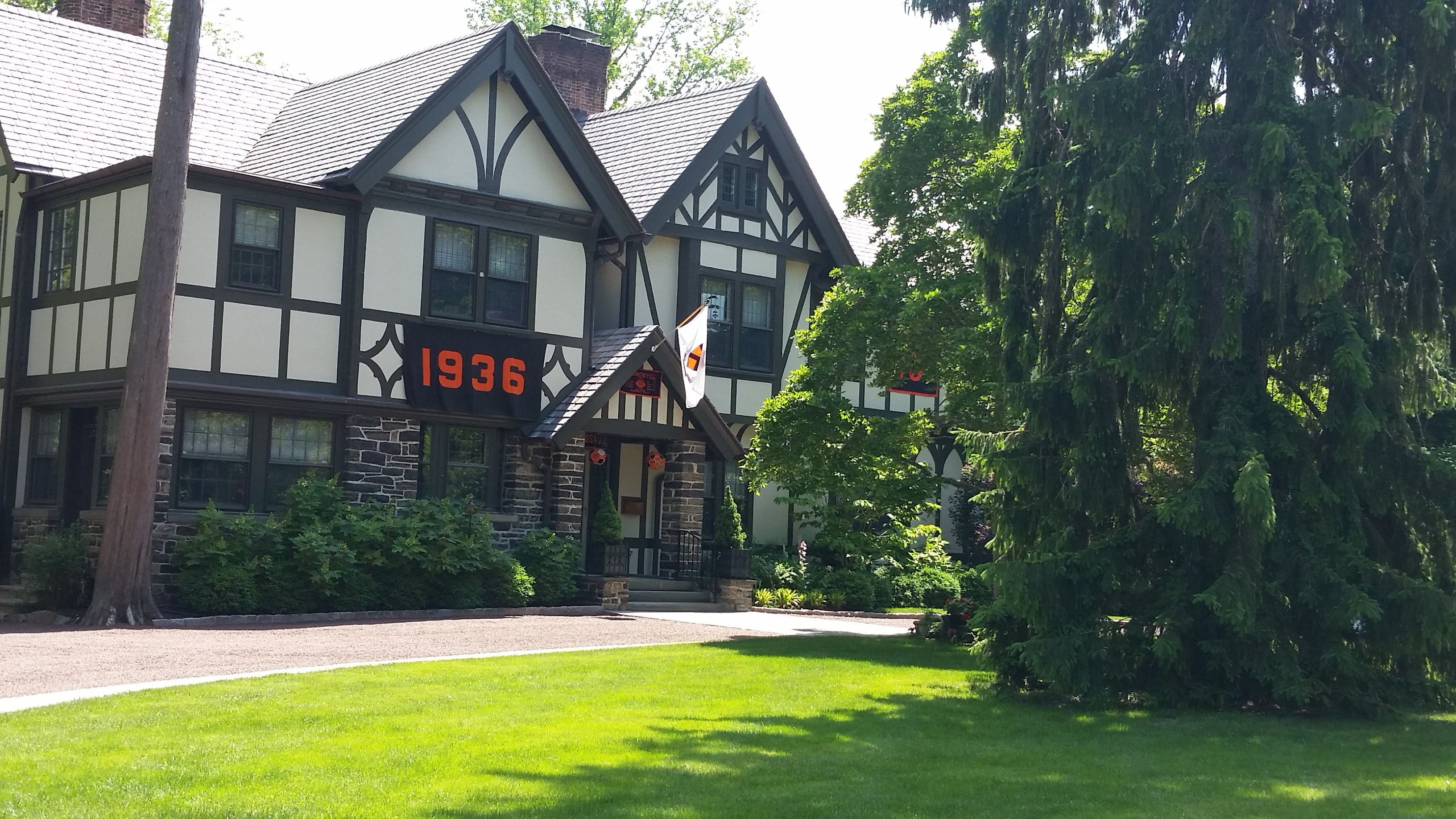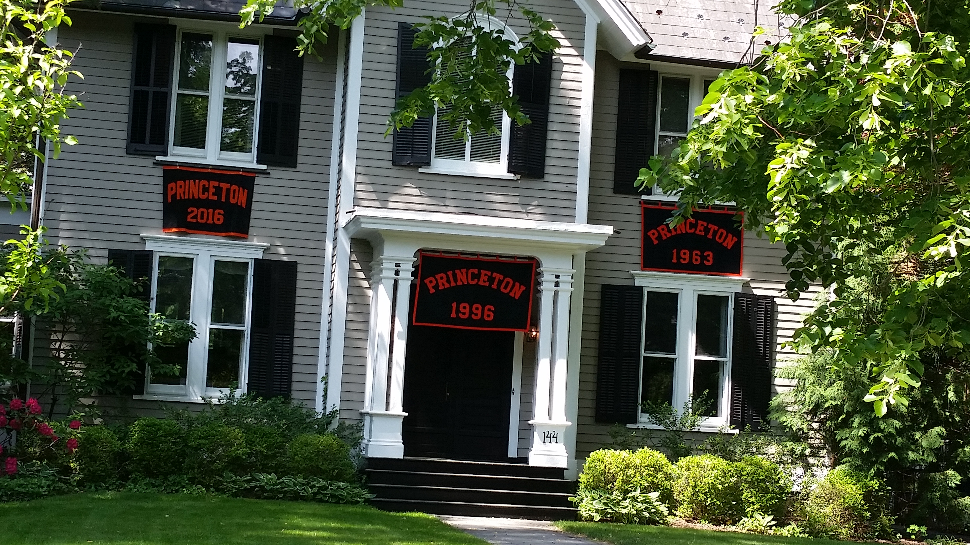 The big ride was Sunday — 31 miles with hills through Princeton and Hopewell and back. Memorial Day weekend traditionally is reunion weekend for Princeton University, when alums come back wearing the most garish black and orange print their class can find (once they hit the 25-year mark) or at least their class jackets. One year we hit the P-rade, when each class marches (we stood near the gathering point for the class meeting for their 20th reunion, dressed as P-rates of the Caribbean). Saturday night we caught glimpses of a heavily black-and-orange fireworks show. And on Sunday, we biked by homes of some proud alums. Here are a couple of examples: